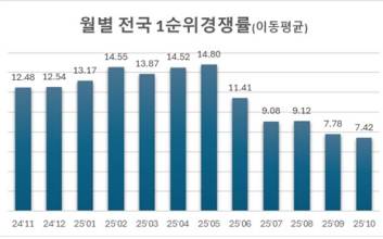 지난달 전국 아파트 청약시장 경쟁률이 연중 최저치를 이어갔다.28일 분양평가 전문회사 리얼하우스가 한국부동산원 청약홈 자료를 분석한 결과 10월 기준 전국 1순위 평균 청약 경쟁률은 7.42대 1로, 전월 대비 0.36포인트 하락해 25개월 만에 최저 수준을 기록했다.전국 평균 경쟁률은 올 5월 14.80대 1로 정점을 찍은 뒤 하락세로 전환해 7월 9.08대 1, 8월 9.12대 1, 9월 7.78대 1에 이어 약세가 이어지고 있다.10월 경쟁률 하락은 수도권 외곽 대규모 단지들이 대거 미달을 보인 결과로 풀이된다.평택 '브레인시티 비스타동원'(0.02대 1)을 비롯해 파주 '운정 아이파크 시티'(0.46대 1), 양주 '회천중앙역 파라곤'(0.17대 1), 인천 미추홀구 '인하대역 수자인 로이센트'(0.72대 1) 등이 부진했다.반면 서울·경기권 규제지역 내 중소규모 단지들은 대조적으로 경쟁률이 높았다.서울 동작구 '힐스테이트 이수역 센트럴'(326.74대 1), 서초구 '반포 래미안 트리니원'(237.53대 1), 분당 '더샵 분당티에르원'(100.45대 1)로 세 자릿수 경쟁률을 나타냈다.수도권 내에서도 서울의 10월 평균 경쟁률이 83.68대 1을 기록한 반면 경기도는 2.75대 1, 인천은 3.6대 1로 지역별 격차가 컸다.김선아 리얼하우스 분양분석팀장은 "수도권 외곽 경쟁률이 약화된 반면 자금 여력이 뒷받침돼야 하는 규제지역에서는 세 자릿수 경쟁률이 나타났다"며 "집값, 대출, 환율 등 불안 요인이 지속되는 상황에서는 서울 중심의 수요 편중이 강화될 가능성이 크다"고 말했다.서지영 기자 2025.11.28 10:46
