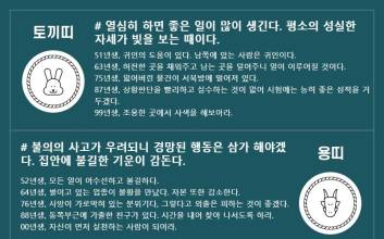 자료제공 : 점신 쥐띠 # 남의 말에 귀 기울일 때이다. 언행을 각별히 조심하라. 48년생, 말 한마디에 천냥 빚을 갚는다 하였다. 60년생, 배우자의 건강에 신경 써라. 큰 돈이 지출될 수 있다. 72년생, 정주지 말라. 헛된 노력으로 후회하게 된다. 84년생, 후회하고 있다 곧 나아지니 휴식하라. 96년생, 자신과 관계없는 일에 너무 나서지마라. 소띠 # 언제까지 지난 일만 돌아볼 생각인가? 49년생, 자신의 재능이 부족한 탓을 부모 탓으로 돌리지 말라. 61년생, 기다리다 시간 놓친 격이니 너무 많은 조심성은 해가된다. 73년생, 오랜 친구가 배신하는구나. 이 어쩐 일인가? 85년생, 돈 때문에 망신수가 있으니 근신하라. 97년생, 마음에 안든다고 한탄말고 순리대로 풀어라. 범띠 # 뜻이 높고 원대하나 알아주는 이가 세상에 없으니 마음만 공허하다. 50년생, 가정에 경사가 있겠다. 62년생, 자신의 뜻을 알아주는 이가 없어 마음이 아픈 하루이다. 일찍 쉬어라. 74년생, 껄끄러운 관계의 사람과 빠른 시간에 화해하도록 하라. 86년생, 이상에 가까운 직종을 만날 수 있다. 98년생, 아껴쓰는 습관을 키워라. 토끼띠 # 열심히 하면 좋은 일이 많이 생긴다. 평소의 성실한 자세가 빛을 보는 때이다. 51년생, 귀인의 도움이 있다. 남쪽에 있는 사람은 귀인이다. 63년생, 허전한 곳을 채워주고 남는 곳을 덜어주니 일이 이루어질 것이다. 75년생, 잃어버린 물건이 서북방에 떨어져 있다. 87년생, 상황판단을 빨리하고 실수하는 것이 없어 시험에는 능히 좋은 성적을 거두겠다. 99년생, 조용한 곳에서 사색을 해보아라. 용띠 # 불의의 사고가 우려되니 경망된 행동은 삼가 해야겠다. 집안에 불길한 기운이 감돈다. 52년생, 모든 일이 어수선하고 불길하다. 64년생, 벌이고 있는 업종이 불황을 만났다. 자본 또한 감소한다. 76년생, 사방이 가로막혀 있는 분위기다, 그렇다고 외출은 피하는 것이 좋겠다. 88년생, 동쪽부근에 가출한 친구가 있다. 시간을 내어 찾아 나서도록 하라. 00년생, 자신이 먼저 실천하는 사람이 되어라. 뱀띠 # 어려운 때를 만나 길을 잃고 방황할 수 있겠으나 능력 있는 윗사람을 만나 해결될 수도 있겠다. 53년생, 어렵거나 잘 안 풀려도 슬기롭게 벗어날 수 있다. 65년생, 시비를 가까이 하지 마라 구설수가 따를 것이니 사람과의 교제를 잘하여라. 77년생, 이익이 같이 들어오니 도처에서 바람이 분다. 89년생, 기다리던 소식이 들려오고 성취되리라. 01년생, 세상엔 뜻대로 안되는 일이 더 많다. 낙심마라. 말띠 # 홀로 머나먼 객지에서 말로 표현하기 힘든 고생을 하는 형국이다. 매사 자중하라. 54년생, 두 가지 소망이 모두 이루어지길 바라니 무리일수 밖에 없다. 66년생, 긍정적인 사고로 소원을 바라는 것이 유익하다. 78년생, 이제라도 유망한 업을 물색하는데 시간을 투자하라. 90년생, 이성이 마음을 알아주지 못하고 만나주려 하지 않으니 심기가 편치 않다. 02년생, 깔끔하게 옷을 입어라. 양띠 # 능력이상의 것을 바라고 희망하니 근심만 쌓이고 일은 풀리지 않는다. 55년생, 기회를 놓치고 이루기 어려우나 희망을 버리지 않는 마음이 중요할 것이다. 67년생, 믿었던 친구나 동료의 배신이나 사기를 당하게 되니 주의하라. 79년생, 이성간에 문제는 해결은 되나 유쾌하지는 않다. 91년생, 새롭게 직업을 구하려 해도 쉽게 구해지지도 않을 뿐더러 전공을 살리지 못한다. 03년생, 버릴 것이 있다면 과감하게 버려라. 원숭이띠 # 주위에 적을 너무 많이 만들어놓아 버렸다. 스스로 화를 불러들인 격이니. 이를 어찌하랴. 56년생, 마음을 비우고 사리사욕을 없애도록 노력하라. 68년생, 육신의 고단함은 판단을 흐리게 한다. 휴식하라. 80년생, 마음만 급하고 실천은 안일하니 뜻대로 이루어지기가 만무하다. 92년생, 평생을 함께 보낼 배우자이니 따뜻하게 대하라. 04년생, 말을 많이 하면 실수가 많아진다. 닭띠 # 사람을 가려서 만나야 한다. 많은 사람 속에 귀인과 방해자가 함께 있다. 57년생, 일이 여의치 않으니 마음에 번민이 만하다. 69년생, 집에 있으면 근심이 많고 밖에 나가면 오히려 마음이 편하다. 81년생, 여자를 가까이 하지 마라. 구설수에 오르게 되면 감당하기 쉽지 않다. 93년생, 좋은 인연이 생기니 진심으로 생각해 볼 시기이다. 05년생, 눈에 보인다고 무조건 믿지마라. 개띠 # 새벽의 정적을 깨고 아침 닭이 우는 소리를 듣게 되니 기쁘다. 58년생, 작은 것은 이룰 수 있겠으니 크게 바라지 않으면 이룰 수 있다. 70년생, 매매가 있다면 작은 것을 얻으려다 큰 것을 얻는 상이니 이루어지겠다. 82년생, 하늘은 스스로 돕는 자를 돕는다 했다. 94년생, 지금까지의 방황했던 마음을 바로 잡는구나. 06년생, 칭찬하는 것을 아끼지마라. 돼지띠 # 좋지 않은 일에 휩싸여 난처해질 수 있으나 의연하게 대처하면 오히려 광명을 찾으리라. 59년생, 확장이나 다른 것을 구상하는 것은 위험한 생각이다. 71년생, 소송이 있다면 다음 기회로 미루어라. 승소하기 어렵다. 83년생, 좋은 친구와 함께 여행을 떠나면 문제의 답이 나오리라. 95년생, 집에 있는 것이 좋으니 외출을 삼가라. 07년생, 다른 사람의 도움을 너무 기대하지마라.