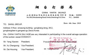 중국 해사 교통국 국영기업 CHINA YANTAI SALVAGE, 신일그룹 돈스코이호 인양사업 참여 의향서 전달