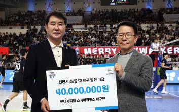 남자배구 현대캐피탈 스카이워커스가 천안 지역 유소년 배구 발전을 위해 발전기금 4000만원 지원했다. 현대캐피탈은 지난 20일, 천안 유관순 체육관에서 열린 진에어 2025~26 V리그 홈경기를 앞두고 천안시 체육회에 발전기금을 전달했다고 밝혔다.이번 발전기금은 천안에 연고지를 둔 천안고등학교, 청수고등학교, 쌍용중학교, 봉서중학교, 부영초등학교, 쌍용초등학교 등 총 6개 학교에 전달되어 유소년 선수들의 훈련 환경 개선과 장비 구입 등에 활용될 예정이다.현대캐피탈 배구단은 2006년부터 현재까지 20년간 사회공헌 활동의 일환으로 천안 지역 유소년 배구선수 양성과 배구 저변 확대를 위해 배구 발전기금을 매년 지원하고 있다.현대캐피탈 배구단 관계자는 "이번 발전기금을 통해 천안의 어린이들과 청소년들이 배구를 통해 즐거움을 느끼고 꿈을 이루는 데 도움이 되길 바란다"고 말했다.한편, 현대캐피탈은 배구단은 크리스마스 이브인 24일 홈경기에서 배구단 선수들과 코칭스테프가 산타가 되어 다양한 기념품을 나눠주는 크리스마스 이벤트를 진행할 예정이다. 경기장을 찾은 팬들에게 선착순으로 소정의 기념품도 나눠줄 예정이다.윤승재 기자 2025.12.20 15:31