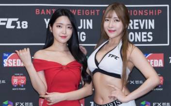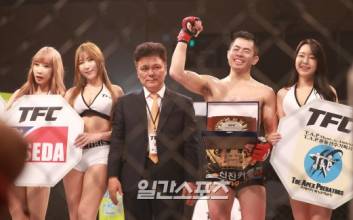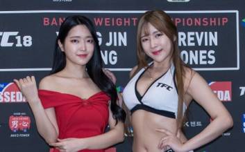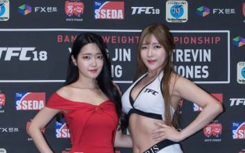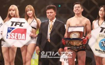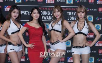 25일 오후 신도림 테크노마트에서 종합격투기 'TFC-18' 경기가 개최되었다. 메인타이틀 경기인 황영진과 트레비 존스가 멋진 경기를 펼쳤다.이날 경기에서 심판판정승으로 승리하며 밴텀급 2대 타이틀을 거머쥔 황영진이 TFC걸 유아리, 김세라, 김라라와 함께 기념 촬영을 하고 있다.박찬우 기자 park.chanwoo@jtbc.co.kr2018.05.25