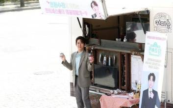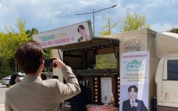 가수 김수찬이 27일 오후 서울 여의도 KBS 본관에서 열린 KBS 예능프로그램 ‘편스토랑’ 녹화 중 팬들이 보낸 커피차 앞으로 나와 포토타임을 갖고 있다.박세완 기자 park.sewan@jtbc.co.kr / 2020.04.27/ 2020.04.27 15:41