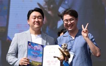 크리에이터 꾸꾸까까가 2024 크리에이터 어워즈에서 애니멀 라이프 부문 공로상을 수상하고 기념 촬영을 하고 있다.