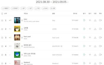 더 키드 라로이(The Kid LAROI)와 저스틴 비버(Justin Bieber)가 함께 부른 '스테이'(STAY)가 미국뿐만 아니라 국내에서도 큰 인기를 끌고 있다.     7일 음원 사이트 멜론에 따르면 더 키드 라로이, 저스틴 비버의 곡 '스테이'가 9월 1주(8월 30일 - 9월 5일) 차 주간차트에서 1위를 기록했다. 외국곡으로는 드물게 꾸준히 상승세를 보여왔던 '스테이'는 이번 주 또 다시 2계단 오르며 정상을 밟았다. 이어 2위에는 이무진의 '신호등'이, 3위에는 에스파의 '넥스트 레벨'(Next Level)이 이름을 올렸다.     저스틴 비버의 경우 지난 5월 3주차 주간차트에서 정규 6집 '저스티스'(Justice)의 타이틀곡 '피치스'(Peaches)로 1위를 기록한 바 있어 눈길을 끈다. 당시 '피치스'는 외국곡으로는 7년 만에 처음 주간차트 1위에 올라 화제가 됐다.     더 키드 라로이의 정제되지 않은 거친 보이스와 저스틴 비버의 중독성 강한 목소리로 완성된 '스테이'는 우리나라뿐 아니라 세계적으로 뜨거운 인기를 얻고 있다. 지난 4일 발표된 빌보드 '핫 100'(HOT 100) 차트에서 1위를 차지하며 4주 연속 자리를 지켰으며 유튜브에 공개된 공식 뮤직비디오는 1억 4000만 뷰에 육박하고 있다.     이런 가운데 숏폼 콘텐트 플랫폼 등에서 인기를 모으고 있는 디핵 (D-Hack), 파테코 (PATEKO)의 곡 '오하요 마이 나이트'(OHAYO MY NIGHT)와 전소미의 신곡 '덤 덤'(DUMB DUMB) 등이 젊은층 공략에 성공하며 눈에 띄는 성적을 내고 있다. '오하요 마이 나이트'는 전주 대비 1계단 상승하며 8위를, '덤 덤'은 2계단 오르며 10위를 기록했다.     '오하요 마이 나이트'는 파테코와 디핵이 작곡하고 디핵이 작사한 곡으로 달콤한 멜로디와 사랑스러운 노랫말을 가졌다. '덤 덤'은 미니멀한 구성의 편곡과 후렴에서 떨어지는 드롭 사운드를 특징으로 한다.     박상우 기자 park.sangwoo1@joongang.co.kr            9월 1주 차 주간차트에서 가장 큰 상승폭을 보인 곡은 이무진의 ‘담아 갈게’로 14계단 상승하며 84위를 기록했다. 이 곡은 프로듀서 조규만의 프로듀싱 프로젝트 ‘리프레시21’(Refresh 21)의 일환으로 발표됐다. 이밖에 카더가든의 신곡 ‘가까운 듯 먼 그대여’가 71위, 환희가 부른 ‘오늘은 가지마 (2021)’이 92위로 진입했다.