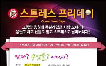 SK가 17일 주중 홈 3연전에서 '스트레스 프리데이(Stress Free Day)' 행사를 실시한다.SK는 오는 17일 삼성과의 홈 경기부터 응원단 운영을 재개한다. SK는 신나는 응원과 함께 다양한 이벤트를 통해 관람객들이 일상생활에서 받은 스트레스를 해소해주고자 이번 행사를 마련했다. 오후 4시30분부터 1루 1, 2층 출입구에서는 '와이번스 안녕하세요' 부스에서 관람객들의 스트레스를 접수 받는다. 자신의 가장 큰 스트레스를 쪽지에 적어 응모하면 7회 초 종료 후 추첨을 통해 사인볼을 제공한다. 또한, 이닝간 교체타임에 응원단상에서는 기왓장 격파, 넥타이부대 댄스타임, 맥주 빨리 마시기, 데시벨을 높여라 등 다채로운 이벤트를 진행하여 다양한 상품을 증정할 예정이다.한편, 이번 3연전 동안 문학야구장 내에 위치한 와이번스샵 에서 1만원 이상의 상품을 구매한 관람객에게 선크림을 증정한다. 이형석 기자