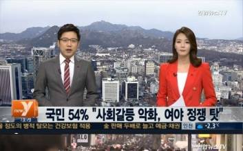 '국민 54% 사회갈등 악화', 여당 야당 언제쯤 안 싸울까?국민 절반 이상은 여야의 정쟁이 사회 갈등을 부채질하는 가장 큰 요인으로 생각하는 것으로 나타났다.대통령 소속 국민대통합위원회가 21일 발표한 '2014 국민통합 국민의식조사'(11.14~18일, 성인남녀 2천명 대상) 결과 응답자의 53.9%가 사회의 갈등을 악화시키는 가장 큰 요인(2가지 중복응답 가능)으로 '여당과 야당의 정치 갈등'을 꼽았다.이어 '경제적 빈부격차'(42.9%), '이기주의와 권리 주장'(34.9%), '언론의 선정적 보도경향'(32.2%), '남북분단으로 인한 이념세력'(14.3%), '영호남 등 지역주의'(14.0%) 순이었다.집단별 갈등 양상으로는 가장 많은 78.2%가 계층갈등이 심각하다고 답했으며, 이념갈등(74.1%), 노사갈등(68.5%), 지역갈등(58.6%), 환경갈등(51.5%), 세대갈등(48.6%), 다문화갈등(47.8%), 남녀갈등(42.5%)이 그 뒤를 이었다.한국 사회 갈등 수준에 대해서는 65.7%가 '매우 심하다' 또는 '심한 편이다'라고 평가했다. 삶의 만족도 평가에선 '만족한다'는 응답이 51.3%였고 '보통이다'는 37.5%, '불만족스럽다'는 10.9%로 나왔다.리서치앤리서치가 실시한 이번 조사는 유·무선 RDD(무작위 전화 걸기)를 이용한 전화면접 방식으로 진행됐다. 95% 신뢰수준에 표본오차는 ±2.2%포인트. 대통합위는 이번 조사 결과를 내년도 '제2차 국민대통합 종합계획'을 수립하는데 반영하는 한편 사회갈등 완화를 위한 정책 방향 제언, '작은 실천 큰 보람' 운동 등 대국민 실천캠페인을 전개하는 데 활용할 계획이다.'국민 54% 사회갈등 악화' 소식을 접한 네티즌들은 "'국민 54% 사회갈등 악화', 그러네", "'국민 54% 사회갈등 악화', 화합한다고 좋지도 않을 것 같아", "'국민 54% 사회갈등 악화', 불만족이 10%밖에 안나옴?", "'국민 54% 사회갈등 악화', 맞네" 등의 반응을 보였다.'국민 54% 사회갈등 악화'온라인 일간스포츠 [사진=연합뉴스TV 캡처]