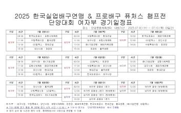 대회 개막일인 7월 2일 여자부는 단양문화체육센터에서 한국도로공사-포항시체육회, 수원특레시청-흥국생명, GS칼텍스-현대건설, 양산시청-정관장전이 열린다. 남자부는 같은날 단양국민체육센터에서 대한항공-부산시체육회, 영천시체육회-한국전력, 우리카드-현대캐피탈, KB손해보험-화성특례시청전이 치러질 예정이다.박태훈 한국실업배구연맹 회장은 "실업팀과 프로팀의 화합, 서로의 응원과 격려를 배우는 것처럼 이번대회를 통해 양측이 잘 소통하는 행복한 축제의 장이 되기를 기대한다"고 밝혔다. 이형석 기자
