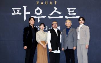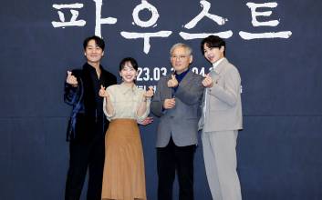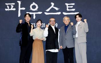 배우 박해수, 원진아, 양정웅 연출, 유인촌, 박은석이 21일 오후 서울 강서구 LG아트센터 서울에서 진행된 연극 '파우스트' 제작발표회에 참석해 포토타임을 갖고 있다. '파우스트'는 독일 문호의 거장 '괴테'의 인생 역작으로 주인공 '파우스트'가 악마 '메피스토'와의 영혼을 건 거래로 인해 펼쳐지는 이야기다. 오는 3월 31일부터 4월 29일까지 LG아트센터 서울에서 공연한다. 서병수 기자 qudtn@edaily.co.kr /2023.02.21. 2023.02.21 15:18