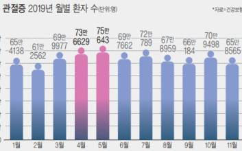 요즘 화창한 봄 날씨에 야외 활동이 늘고 있다. 특히 공원이나 운동장에서 달리거나, 산을 오르거나, 자전거를 타는 등 겨우내 못했던 운동을 하는 사람들이 많다. 하지만 갑작스러운 운동은 오히려 건강을 해친다. 특히 무릎에 부담이 커져 염증이 생기는 무릎 관절증 환자가 1년 중에 가장 많을 때가 요즘이다. 4·5월 무릎 관절증 환자 급증 무릎 관절증은 무릎에 염증이 발생하는 모든 질환을 의미한다. 1년 중 봄철에 무릎 관절증 환자가 가장 많다. 실제로 건강보험심사평가원의 2019년 무릎 관절증 환자 수를 보면, 2월에 61만2562명이던 환자는 3월에 69만9977명으로 8만 명 이상 급증했다. 4월에는 증가세가 계속 이어져 73만6629명으로 70만명대로 올라가고 5월에는 1년 중 가장 많은 75만643명을 기록했다. 4·5월에 무릎 관절증 환자가 급증하는 이유는 추운 겨우내 무릎 주변 근육이 경직되고 딱딱해져 유연성이 떨어져 있는 상태에서 봄을 맞아 야외 활동과 함께 무릎 사용이 증가하기 때문이다. 서울성모병원 정형외과 김만수 교수는 “무릎 주변 근육은 관절에 가해지는 부담을 줄여주는 역할을 한다”며 “그런데 겨우내 추운 날씨에 근육이 약해지고 딴딴해져 운동 중 가해진 힘이 무릎 관절로 바로 전해져 염증이 생기고 통증이 나타난다”고 말했다. 무릎 관절증의 대표적인 질환은 퇴행성 무릎 관절염과 반월상 연골판 손상, 슬개골 연골 연화증 등이 있다. 이 중에서도 무릎 관절증이라고 하면 흔히 퇴행성 무릎 관절염을 의미한다. 대표 질환 '퇴행성 관절염'…방치 시 통증에 잠 못 이뤄 퇴행성 무릎 관절염은 관절을 보호하고 있는 연골의 점진적인 손상이나 퇴행성 변화로 인해 관절 연골이 닳으면서 무릎뼈가 서로 부딪쳐 염증이 생기고, 통증과 부종 등의 증상이 나타나는 질환이다. 초기에는 별것 아니지만 방치했다가는 치명적인 상황을 맞게 된다. 퇴행성 무릎 관절염은 초기(1기), 중기(2~3기), 말기(4기)로 나눌 수 있다. 1기에는 연골이 닳아 두께가 조금 얇아지는 정도로 무릎이 아프기 시작하고, 오래 앉았다. 일어서려면 무릎이 뻣뻣한 느낌이 든다. 조기에 발견하면 체중 감량과 물리치료, 운동요법으로도 치료할 수 있다. 2기는 연골이 닳아 찢어지고 너덜너덜해져 연골 표면이 울퉁불퉁해지고, 부분적으로 떨어져 나간 작은 연골 조각들이 윤활액 속에 떠다녀 무릎을 움직일 때 통증이 심해진다. 특히 계단을 오르내릴 때 아프고 쑤신다. 이때부터는 약물치료와 주사 치료가 가능하다. 3기부터가 문제다. 연골이 더욱 손상돼 연골 아래 뼈가 비정상적으로 뾰족하게 자라 걸을 때마다 극심한 통증이 나타난다. 조금만 걸어도 다리가 붓고 맨눈으로 보기에도 다리가 휘어져 보인다. 약물 및 주사 치료의 효과가 작아져 연골 성형술, 자가연골 이식술, 교정절골술 등이 시행된다. 특히 4기 말기에는 연골이 다 닳아 뼈끼리 거의 맞닿은 상태로 무릎이 퉁퉁 붓고 열이 나고, 가만히 있어도 무릎이 쑤시고 아프다. 밤에는 아파서 잠을 이룰 수 없을 정도이며, 움직일 때는 무릎이 끊어질 듯한 통증을 느낀다. 살아도 사는 게 아닐 정도로 삶의 질이 급격히 떨어지게 된다. 말기 때는 인공관절 수술로 치료가 가능하다. 인공관절 수술은 망가진 관절 대신 특수 금속 막을 관절 겉면에 씌운 후 그 중간층에 특수 플라스틱을 넣어 물렁뼈 역할을 하도록 해 관절이 유연하고 정상적으로 움직일 수 있도록 해준다. 문제는 몸이 약해진 고령자들이 수술을 받기 때문에 회복이 더디고 부작용에 대한 우려가 높아 꺼리는 경우가 적지 않다는 점이다. 하지만 요즘은 수술 부위를 줄이고 정확도를 높여 회복과 재활에 도움을 주는 로봇 인공관절 수술을 진행하는 경우가 늘고 있다. 로봇 수술은 3D CT로 인공관절 크기와 뼈 절삭 범위, 삽입 각도 등 수술 계획을 정밀하게 세울 수 있어 수술 정확도를 높이고 회복 및 퇴원이 빨라질 수 있다. 2018년 본앤조인트저널에 발표된 논문 ‘로봇 수술의 조기 기능 회복 및 퇴원 기간 단축’에 따르면, 로봇 인공관절 수술을 받은 환자들이 일반 인공관절 수술을 받은 환자보다 11시간 더 빨리 회복했으며, 퇴원까지 걸린 시간도 28시간 단축된 것으로 조사됐다. 인천힘찬종합병원 정형외과 송문복 의료원장은 “마코 로봇 인공관절 수술의 회복이 더 빠른 이유는 출혈량이 적고 그에 따른 부종과 통증이 줄어 재활 속도가 향상되기 때문”이라며 “로봇 수술의 적은 출혈은 고령 환자들의 수술 부담을 낮추는 데도 도움이 된다”고 말했다. 무릎 통증 시 냉찜질…2~3일 후 호전 안되면 병원 방문해야 봄철 무릎 건강을 지키기 위해서는 갑자기 운동량을 늘리는 것을 피해야 한다. 본인의 체력에 맞게 서서히 늘려주면서 하루 30분 이상 매일 하는 것이 좋다. 또 운동 전에는 반드시 스트레칭으로 긴장된 근육을 풀어줘야 부상의 위험을 낮출 수 있다. 만약 운동 후 갑자기 통증과 열감이 생기고 부기가 있으면 하루 이틀 정도 냉찜질을 하면 증상을 줄여준다. 김만수 교수는 “갑자기 통증이 나타나는 것은 염증 반응 때문인 경우가 많다. 아이스팩으로 하루 2~3번 냉찜질을 해주면 혈관을 수축시키고 혈