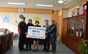 장원삼의 부모인 장복수(왼쪽 두 번째) 김귀남(가운데)씨가 지난 29일 마산 용마고를 들러 1000만원을 기탁하고 있다. 용마고 제공 2014년 마지막 날, 삼성 장원삼(31)의 훈훈한 기부 소식이 전해졌다. 이제 '기부천사'로 불러도 손색없을 정도다. 장원삼은 지난해 연말 자신의 모교에 총 1억7000만원을 기부했다. 그외 대구, 경남 창원, 경북 청도 등 지역사회에 불우이웃돕기 성금과 쌀 기부를 했다. 4년간 총 60억원에 FA(프리 에이전트) 계약을 맺은 지난해 겨울에만 대략 2억원에 가까운 '통 큰 기부'를 했다. 장원삼의 기부 릴레이는 2014년에도 계속됐다. '혹시나' 하는 마음에 기자가 29일 모교에 전화를 했는데, 때마침 이날 기부금을 전달했다고 한다. 장원삼은 이날 구단지정 병원에서 종합검진을 받은터라 그의 부모인 장복수, 김귀남씨가 직접 창원시 사파초-신월중-용마고를 돌며 각 1000만원씩 야구 장비 구입 비용을 기탁했다. 앞서 2000만원을 전달한 부산 경성대를 포함해, 올 겨울에도 총 5000만원의 기부 보따리를 풀었다. 김성훈 용마고 감독은 "장원삼은 후배들에게 큰 귀감이 된다. 오늘 교장 선생님이 방학식에서 장원삼의 이름을 언급했을 정도다"고 말했다. 장원삼은 웬만한 선수나 일반인이 다 갖고 있는 것에는 욕심을 내지 않는다. 결혼 전까지만 해도 차 없이 지냈고, 지난해 여름까지 스마트폰 대신 2G 휴대전화를 사용했다. 그래서 '뚜벅이족', '원시인'으로 불린다. 검소한 생활을 하는 대신 알뜰히 저축한다. 지난 10월에는 '저축의 날' 금융위원장 표창을 수상했다.야구로 받은 사랑, 장원삼은 그 돈을 후배들을 위해 사용한다. 결혼식을 하루 앞둔 지난 6일에는 2014 야구대제전에 참가하는 용마고 후배들을 응원차 경기장을 방문했다. 김성훈 감독은 "장원삼의 기부는 일회성에 그치지 않는다. 좋은 일을 하고서도 티내지 않는다. 참 본받을 점이 많은 선수다"라고 말했다. 장원삼은 본지와의 통화에서 "에이~ 난 조금 기부했을 뿐이다"고 손사래쳤다. 오히려 "(이)종욱(NC)이 형도 오늘(29일) 모교 영남대에 3000만원을 기부했더라. 다른 선수들도 평소 홈런과 안타, 탈삼진 등으로 기부금을 낸다"며 겸손해했다. 그의 기부는 최근 시작된 게 아니다. 장원삼은 "입단 당시에만 하더라도 액수가 크지 않았다. 지난해 FA 대박을 터뜨리고 조금씩 여유가 생기면서…"라고 웃었다. 특히 졸업한 지 십수년이 지난 모교에 여전한 사랑을 보여주고 있다. 그는 "내가 나온 학교이니까 한 번 더 눈길이 가고 돕고 싶다"고 밝혔다. 장원삼 역시 기부를 통해 얻는 것이 많다. 그는 "지난 5월 용마고가 황금사자기에서 준우승을 차지했다. '형이 선물한 방망이 덕에 좋은 성적을 냈다. 고맙다'는 후배 코치의 얘기를 듣고 나도 보람을 많이 느꼈다"고 얘기했다. 기부 릴레이는 앞으로도 계속된다. 장원삼은 "모교가 없어질 때까지 기부는 계속 해야죠"라며 "앞으로도 능력이 되는 한 계속 돕고 싶다"고 말했다. 이형석 기자 2014.12.31 06:00