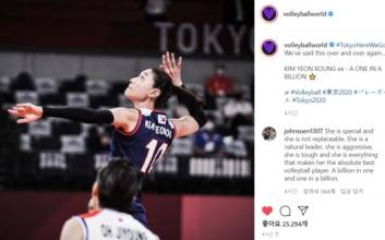 전 세계가 김연경의 '마지막 올림픽'에 열광하고 있다. '김연경 보유국' 한국은 4일 오전 9시 일본 도쿄 아리아케 아레나에서 열린 2020 도쿄 올림픽 여자 배구 8강 터키전에서 세트 스코어 3-2(17-25, 25-17, 28-26, 18-25, 15-13)로 승리했다. 에이스 김연경이 28득점을 올리며 최고의 활약을 펼쳤다. 국제배구연맹(FIVB)은 경기 후 운영 중인 공식 인스타그램 '발리볼 월드'를 통해 "우린 이미 수없이 이야기했다. 김연경은 10억명 중 단 한 명밖에 없는 선수다"라며 극찬했다. 전 세계 배구팬이 공감했다. 한 팬은 "김연경은 특별하고 대체 불가능하다. 타고난 리더이며, 공격적이고 터프하다. 그녀의 모든 것이 김연경을 세계 최고의 선수로 만든다"고 적었다. 이 댓글은 FIVB에 의해 가장 상단에 고정되며 많은 좋아요를 기록했다. 이날 김연경을 상대 팀으로 만났던 터키팬 역시 예외는 아니었다. 한국의 승리를 인정하며 축하 메시지를 전달했다. 한 터키팬은 "한국은 형제의 나라다. 두 나라 모두 축하한다"라고 남겼다. 터키는 이번 대회에서 사상 첫 올림픽 8강 무대에 오른 바 있다. 156만명의 팔로워를 지닌 '발리볼 월드' 계정에서는 해외 팬들의 김연경을 향한 끝없는 응원과 사랑이 느껴졌다. 세계적인 스타 김연경에 팬들은 "레전드", "아시아의 자존심", "배구계는 김연경을 절대 놓쳐서는 안 된다" 등의 반응으로 힘껏 응원을 보탰다. 강혜준 인턴기자