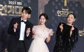 배우 고건한, 서혜원, 이상희가 31일 오후 서울 마포구 SBS 프리즘타워에서 열린 '2025 SBS 연기대상' 레드카펫 행사에 참석해 인사말을 하고 있다. 서병수 기자 qudtn@edaily.co.kr /2025.12.31/ 2025.12.31 19:13