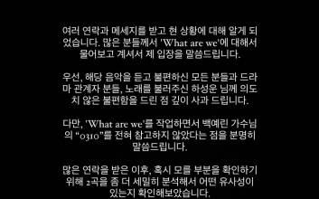 가수 백예린이 tvN 토일드라마 ‘엄마친구아들’ OST ‘왓 아 위’(What are we)에 표절 의혹을 제기한 가운데, 작곡가가 직접 해명했다.‘왓 아 위’ 작곡가 whyminsu는 4일 자신의 SNS에 “해당 음악을 듣고 불편하신 모든 분들과 드라마 관계자분들, 노래를 불러주신 하성운 님께 의도치 않은 불편함을 드린 점 깊이 사과 드린다”고 전했다.그러면서 “다만 ‘왓 아 위’를 작업하면서 백예린 가수님의 ‘0310’을 전혀 참고하지 않았다는 점을 분명히 말씀드린다”며 “멜로디를 상세히 분석해 봐도 ‘0310’과 동일한 부분은 없다”고 강조했다.이어 “어려운 기회를 통해 곡을 발표하게 된 신인 작곡가의 입장에서 표절 시비라는 건 굉장히 두려운 낙인이다. 그래서 두려움에라도 확실히 말씀드리자면 ‘0310’을 베껴서 작업하지 않았다는 것을 다시 한 번 말씀드린다”고 덧붙였다.
