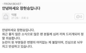 팬들은 가려운데, 긁어주지 않는다. 긁어달라고 애원해도 들어주지 않았다.'태도논란'에 휩싸인 장현승이 스스로 화를 키우며 데뷔 이후 가장 큰 위기에 봉착했다. 화가 난 당사자가 곧 '열혈팬들'인데다 비스트 전체의 문제로 퍼져가고 있음을 감안하면 작은 문제가 아닌 셈. 하지만 장현승은 대수롭지 않은 일인듯 안일한 대처를 일삼았다. 소속사도 '늑장대응'으로 일관하긴 마찬가지. 핵심 멤버의 이미지가 땅에 떨어지고 나머지 멤버들과 비스트 라는 그룹 전체에도 큰 타격을 준 논란을, 어째서 팔짱만 끼고 바라본 것일까. 그 사이 비스트의 팬덤은 양분화됐고, 뒤숭숭한 기운이 가득해졌다. ▶ '태도 논란' 장현승, 묵묵부답 → 늑장대응 → 무성의 역풍 '답답'이야기의 시작은 20일 장현승의 팬임을 자처한 한 네티즌의 글로 시작됐다. 그는 수년전부터 장현승이 불성실한 태도를 보여왔으며, 거짓말로 핑계를 댄 후 고가의 팬사인회에 불참하는 등, 팬들을 무시했다며 사과와 설명을 요구했다. 이에 온라인상에는 장현승이 과거 라디오·방송·공연 등에서 불성실한 모습으로 무대를 소화하거나, 음정을 바꾸어 부르는 모습, 인터뷰 도중 휴대폰을 보는 모습등이 회자됐다.정황이 담긴 자료들까지 수없이 읽히고 보여지자, 장현승의 태도논란은 더 이상 화가 난 한 팬의 근거없는 불만토로 수준이 아니었다. 하지만 이러한 상황에서도 장현승과 소속사는 단단하게 입을 닫았다.더 작은 논란이 불거져도 길어야 반나절안에 정확한 요점이 담긴 해명(사과)을 하는 현 연예계 풍토와는 정반대의 길을 걸은 셈. 사건의 전환점이 될만한 해명이나 사과가 없자 탈퇴설에 왕따설으로까지 번졌지만, 장현승과 소속사는 오해를 풀고 싶은 억울함조차 없어보였다. 비스트 측 한 관계자는 24일 오전 일간스포츠와의 통화에서 "이미 다 지난 일"이라며 구체적인 언급을 아꼈다. 이어 장현승은 그날 저녁에서야 팬카페에 사과문을 담았지만 이는 불난집에 기름을 붓는 꼴이 됐다. 그는 '최근 좋지 않은 소식으로 많은 팬 분들께 심려 끼쳐 드리게 돼 정말 죄송합니다'라고 적었다. 이어 '논란이 된 부분들은 변명의 여지없는 제 불찰이며 진심으로 뉘우치고 반성하고 있습니다'라며 '저와 비스트를 사랑 해 주시는 팬 분들을 위해 이렇게라도 용기를 내 진심을 전하고자 합니다. 다시 한번 심려끼쳐 드려 대단히 죄송합니다'라고 밝혔다.다섯줄에 불과한 이 사과문은 팬들에 대한 배려가 전혀 느껴지지 않았다. 상처받은 팬심을 어루만지려는 의도도, 꼼꼼한 해명을 해 팬들의 화를 누그러트리려는 생각도 읽히지 않았다. 형식적인 어휘로만 채워져 '소속사가 시켜서 억지로 썼나'라는 팬반응이 나왔다. 이후 소속사도 나서 사과했지만 역시 성난 팬심을 잠재우기는 역부족이었다. 비스트가 속한 큐브엔터는 굴지의 대형 기획사. 발빠른 대처능력으로 논란이 불거진 직후 공연 영상과 라디오 출연 영상, 팬카페에 불참했던 사연을 조목조목 해명하며 팬들이 듣고 싶은말을 들려줬다면 상황이 현재처럼 악화됐을까. ▶ '일베 논란' 류준열, 소속사 → 본인→ 지인 → 법적대응까지 '북북'비슷한 시기에, 장현승 측과는 '정반대'의 길을 걸은 스타가 있다. tvN '응답하라1988'에 이어 '꽃보다 청춘'에 연이어 출연하며 데뷔 후 최고의 인기가도를 달리고 있는 류준열이다. 그는 '다된 밥에 '일베'를 떨어뜨릴뻔 했지만 신속하고 '똑똑한' 대처로 조기진압에 성공했다.사건의 발단은 류준열이 스스로 SNS에 올린 사진과 글. 그는 절벽을 오르는 자신의 모습이 담긴 사진에 '엄마 두부 심부름가는 길'이라고 썼다. '절벽'과 '두부'는 두부 외상으로 절벽에서 떨어져 사망한 고 노무현 전 대통령을 비하하기 위해 극우 사이트 '일간베스트'(이하 '일베')에서 쓰이는 어휘. 단 한장의 사진만으로도 충분히 '일베' 활동을 의심받을만 했다.류준열의 소속사 씨제스엔터테인먼트는 영화 '글로리데이' 행사 참여로 논란을 인식하지 못한 류준열 대신 나섰다. 소속사는 '두부'라는 단어와 절벽이라는 공간이 등장한 우연성을 강조하며 류준열이 '일베' 유저가 아님을 분명히 했다. 이어 행사를 마친 류준열은 즉각 본인이 나섰다. 그는 본인이 '엄마 두부 심부름 가는 길'이라는 표현을 쓴 이유에 대해 '지인이 등반하는 사진에 '출근하러 가는 길'이라고 적은 내용을 재밌게 본 기억이 나서 표현을 빌려썼다'고 말했고, '두부'에 대해서는 '어머니의 두부와 콩나물 심부름을 가끔 했던 아들로서 쓴 표현'이라고 구체적으로 해명했다. 또한 그는 자신이 '일베' 유저가 아님을 강조하며 '특히 존경하는 분 (고 노무현 전 대통령)이 언급되는 것도 속상하다"고 진실된 마음을 담았다.본인과 소속사의 발빠른 해명과 사과에 지인들도 불편함없이 동참했다. 류준열의 20년 지기라고 밝힌 한 네티즌은 '(류준열이) 노 전 대통령을 좋아했으며, 노 전 대통령의 엽서도 선물해 줬던 친구"라고 강조했다. 또한 절친으로 알려진 배우 변요한은 자신의 인스타그램에 '글로리데이' 포스터를 올린 뒤 "미풍에 흔들리지 말고, 정진. 화이팅"이라고 게재했다. 이어 영화 '거인' 김태용 감독은