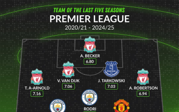 2020/21시즌부터 2024/25시즌까지 최근 5년간 프리미어리그를 대표하는 '베스트11'이 데이터 전문업체 후스코어드(WhoScored) 집계로 공개됐다. 이 명단에서 손흥민(토트넘)은 유일한 한국인, 그리고 토트넘을 대표하는 공격수로 선정됐다.이번 라인업은 최근 5시즌 동안 프리미어리그에서 100경기 이상을 뛴 선수들 가운데, 후스코어드 평점이 가장 높은 선수들을 포지션별로 구성했다. 손흥민은 평균 평점 7.21점을 기록하며, 오른쪽 공격수로 포함됐다. 전 동료 해리 케인(7.58점)과 함께 최전방에 이름을 올려, 두 선수 모두 토트넘의 꾸준한 핵심 전력임을 입증했다.공격진에는 손흥민, 해리 케인, 리버풀의 모하메드 살라(7.32점)가 나란히 포진했다. 미드필더진은 맨체스터 시티의 케빈 더 브라위너(7.48점), 로드리(7.35점), 맨체스터 유나이티드의 브루노 페르난데스(7.30점)가 채웠다. 리버풀 알리송 베커(6.80점)가 골키퍼로 선정됐고, 수비라인 역시 리버풀의 트렌트 알렉산더-아놀드(7.16점), 버질 반 다이크(7.06점), 앤드류 로버트슨(6.94점)과 함께, 에버턴의 제임스 타코우스키(7.03점)가 센터백으로 이름을 올렸다.이번 명단에서 리버풀(5명), 맨시티(2명), 토트넘(2명), 맨유(1명), 에버턴(1명) 순으로 분포돼, 최근 5년 간 이 팀들이 리그에서 누적된 경쟁력을 보여줬다.특히 손흥민의 선정은 EPL 전체에서 아시아 출신 선수로는 유일하며, 5시즌 연속 100경기 이상을 소화하며 축적한 꾸준한 영향력과 활약이 데이터로 입증된 결과다. 손흥민은 2020/21시즌부터 매 시즌 두 자릿수 득점을 기록하며 팀 공격을 이끌었다.이번 베스트11은 단순 인기 혹은 득점 수에 기반하지 않고, 경기 내 실제 평점과 누적 성적을 객관적으로 반영했다는 점에서 의미가 크다. EPL에서의 오랜 기간, 일정 수준 이상의 경기력을 안정적으로 유지해온 선수들만이 이 명단에 들 수 있었다.리버풀은 골키퍼, 수비수, 공격수까지 공격과 수비의 균형 잡힌 선택으로 리그 최상위권 경쟁력을 재확인했다. 맨시티는 전통적 미드필드 강자들이 함께했고, 토트넘은 손흥민과 케인이 나란히 명단에 들어 팀 단위로도 평가받았다. 에버턴에선 타코우스키가 유일하게 포함됐다.프리미어리그 베스트11을 통해 손흥민이 유럽 정상급 무대에서 지속적으로 경쟁력을 증명해 왔음을 다시 한 번 확인할 수 있다. 이는 한국 축구의 위상에도 의미 있는 기록으로 남게 됐다.온라인 일간스포츠