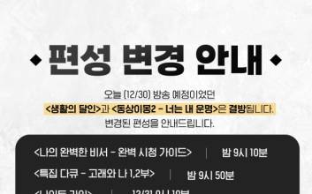 SBS ‘생활의 달인’과 ‘동상이몽2-너는 내 운명’이 결방된다.SBS 측은 30일 “이날 방송 예정이었던 ‘생활의 달인’과 ‘동상이몽2-너는 내 운명’은 결방된다”고 밝혔다.‘나의 완벽한 비서 - 완벽 시청 가이드’가 오후 9시 10분에 방송되며, ‘특집 다큐 - 고래와 나 1, 2부’ 재방송이 오후 9시 50분부터 편성됐다.한편, 지난 29일 오전 9시 3분께 태국 방콕발 제주항공 7C 2216편 여객기가 무안국제공항 활주로로 착륙을 시도하던 중 사고를 당했다. 사고가 난 기종은 B737-800으로, 승객 175명과 승무원 6명 등 총 181명이 타고 있었다. 태국인 2명을 제외하고는 모두 한국인이었으며 승무원 2명을 제외한 179명이 전원 사망한 것으로 확인됐다. 정부는 내년 1월 4일까지 국가애도기간으로 지정했다. 이수진 기자 sujin06@edaily.co.kr 2024.12.30 17:57