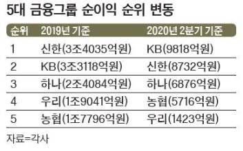 올해 내내 여파가 이어지고 있는 사모펀드 환매 중단 사태와 코로나19 피해기업 금융 지원 탓에 국내 5대 금융그룹들의 순위가 요동쳤다. 사모펀드 충당금 등 부담으로 신한금융·우리금융이 각각 KB금융·농협금융에 역전당했다.     28일 농협금융은 올해 2분기 당기순이익은 5716억원으로 금융시장 안정화에 따른 유가증권 및 외환·파생 손익 회복 등으로 1분기(3387억원) 대비 68.8% 증가했다고 밝혔다. 상반기 이자이익은 3조9201억원, 수수료 이익은 7658억원을 기록했다.       지금까지 발표된 4개 금융그룹의 올해 2분기 순이익은 KB금융 9818억원, 신한금융 8732억원, 하나금융 6876억원, 우리금융 1423억원 순이었다.     지난해 연간 기준 순이익이 신한(3조4035억원), KB(3조3118억원), 하나(2조4084억원), 우리(1조9041억원), 농협(1조7796억원) 순서였던 것과 비교하면, 신한은 KB에 순위를 뺏겼고, 우리 자리를 농협이 차지하게 됐다.     금융지주 간 실적 희비를 가른 것은 부실 사모펀드 환매중단 사태였다. KB와 농협은 DLS(독일 헤리티지 파생결합증권)·라임 사태와 무관해 2분기 펀드 관련 충당금 적립에 따른 이익 감소 폭이 크지 않았던 탓이라는 분석이다.      신한금융의 경우 신한금융투자(신한금투)가 판매한 DLS 펀드와 라임 펀드 관련한 충당금으로 순이익이 줄었다. DLS 펀드를 3800억원어치 판매한 충당금으로 2분기 1248억원을 쌓았고, 라임 펀드 판매액의 3분의 1 수준인 769억원도 영업외비용에 반영됐다.        여기에 신한금융은 코로나19 금융지원 성격의 대출 관련 미래 부실 위험과 관련한 충당금도 1850억원 적립했다. 펀드 관련 2017억원에 코로나19 금융지원 충당금까지 총 3867억원의 순이익이 줄어들며 KB금융에 1위 자리를 빼앗겼다.       KB금융은 향후 코로나19 등의 영향으로 건전성이 나빠질 경우를 대비한 충당금 2060억원만 쌓아뒀다.      우리금융도 신한과 마찬가지로 2분기에 DLS·라임 등 사모펀드 관련 비용 충당금 1600억원과 코로나19 대출 등과 관련된 충당금 2375억원 등 모두 3356억원의 충당금을 쌓으며 농협과 순위가 뒤바뀌었다.      순위를 지킨 하나금융은 사모펀드 관련 준비금 1185억원을 비롯해 2분기 총 4322억원에 이르는 충당금을 적립했지만, 상반기 순이익이 1조3446억을 기록하며 2012년 이후 최대 실적을 세웠다.       여기에는 하나금융투자가 상반기 작년 동기보다 12.9% 많은 1725억원의 순이익을 거둬 역대 최대 실적을 올린 영향이 컸다. 올해 2분기 ‘동학 개미 운동’ 등으로 계열 증권사의 이익이 많이 늘어난 탓이다.     이에 하나금융투자는 올 상반기에 작년 동기보다 12.9% 많은 1725억원의 순이익을 거둬 역대 최대 실적을 올렸다.        권지예 기자 kwon.jiye@joongang.co.kr