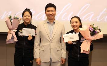 “저희가 직접 상패를 준비했어요.”대표팀 선수들이 회장님에게 깜짝 시상을 했다. 역대 최고 성적으로 이미 분위기가 정점에 오른 수영대표팀과 대한수영연맹의 화기애애한 분위기가 이런 훈훈한 장면을 만들어냈다. 지난 24일 서울 송파구 올림픽파크텔. 이곳에서는 대한수영연맹이 주최한 2022 항저우 아시안게임 수영 대표팀 포상금 수여식이 열렸다. 금메달을 딴 선수는 1000만원, 단체전 금메달은 2000만원(출전 선수들이 이 금액을 분배), 은메달은 200만원(개인전)과 400만원(단체전), 동메달은 100만원(개인전), 200만원(단체전)으로 정해져 선수들의 성적에 따라 포상금이 주어졌다. 이번 항저우 아시안게임에서는 경영에서만 역대 최고 성적인 메달 22개(금 6, 은 6, 동 10개)를 따냈다. 다이빙 역시 메달 6개(은 2, 동 4개)로 단일 아시안게임 최다 메달이 나왔다. 경영은 아시안게임 참가 사상 처음으로 일본의 성적을 앞질렀다. 수영대표팀 선수들은 이달 초 항저우 아시안게임을 마치고 귀국했고, 휴식도 없이 곧바로 전국체전에 참가했다. 그리고 이날 오랜만에 대표팀으로 한자리에서 다시 만나자 젊은 선수들은 반가움에 왁자지껄한 유쾌함이 넘쳤다. 단순히 유쾌하기만 한 게 아니었다. 젊은 선수들이 이런 생각까지 해냈다 싶을 정도로 뜻깊은 장면도 나왔다. 이날 행사가 끝나갈 무렵, 경영대표팀의 주장인 김서영(29, 경북도청)이 행사장 앞으로 나서서 마이크를 잡았다. 그는 “선수들이 수영연맹 회장님과 임원님들을 위해 직접 상패를 준비했다”며 작은 시상식을 시작했다. 대표팀 선수들이 모두 일어나서 앞으로 나왔고, 정창훈 대한수영연맹 회장과 이성복 부회장, 김승훈 사무처장 등을 부르더니 한명씩 감사패를 전달했다.