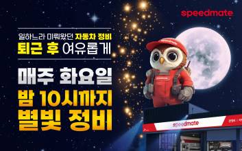 '별빛정비의 계절'이 돌아왔다.스피드메이트가 27일 매주 화요일 오후 10시까지 정비를 지원하는 ‘별빛정비’를 연말까지 시행한다고 밝혔다. 별빛정비는 지난해 수도권에서부터 시범 운영을 시작한 데 이어 서비스 범위를 넓혀왔다. 올 가을 겨울 시즌에 맞춰 진행하는 이번 별빛정비는 전국100개 이상의 매장에서 펼쳐진다. 평일 주간엔 시간을 내기 어렵고 주말에는 정비 예약 경쟁이 치열해 차량 정비가 쉽지 않았던 직장인들에게 동계 차량 고장을 예방하는 좋은 기회가 될 것으로 기대된다. 별빛정비는 별도의 추가 공임없이 주간과 동일한 서비스로 제공되고, 스피드메이트 홈페이지를 통해 예약할 수 있다. 개인정보 마케팅 활용 동의 고객 대상으로 사전결제 후 방문 시 커피쿠폰을 증정하며, 개인SNS에 별빛정비 후기를 게시하면 스피드메이트 정비 5만원 할인권을 증정하는 이벤트도 진행한다. 스피드메이트는 별빛정비와 같은 고객 편의를 증진하는 서비스를 지속 개발 및 제공함으로써 국내 대표 차량 관리 브랜드 이미지를 강화해 나간다는 방침이다. SK스피드메이트 관계자는 “차량 고장과 사고가 잦은 동계시즌을 대비해 바쁜 직장인들도 일과 시간 이후 차량 정비가 가능하도록 별빛정비 서비스 매장을 확대했다”며 “전국 580여 스피드메이트 매장에서 더욱 편리하고 안전한 정비 경험을 제공해 고객의 행복한 차량 운행을 지원하겠다”고 말했다.김두용 기자 2025.10.27 11:48