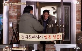 '한끼줍쇼' 태사자와 NRG가 한 끼 도전에 성공했다. 29일 오후 방송된 JTBC '한끼줍쇼'에서는 90년대 원조 꽃미남 그룹 태사자 김형준·박준석, NRG 천명훈·노유민이 밥동무로 출연해 일산 설문동에서 한 끼에 도전했다. 이날 태사자 김형준·박준석, NRG 천명훈·노유민은 90년대 향수를 자극하는 '도', '할 수 있어' 무대를 탑골가요 콘셉트로 각각 선보이며 화려하게 등장했다. 과거 예능 프로그램에서도 라이벌 구도로 활약한 바 있는 두 팀. 20년 만에 만나게 된 태사자와 NRG는 '데뷔 순서'에 대한 질문에 NRG는 1997년 10월 28일, 태사자는 97년 10월 20일이라고 밝혔다. 규동형제가 "두 팀 라이벌 아니었냐"고 묻자 천명훈은 "언론이 만들어낸 거품이 조금 있었다. 당시 태사자가 NRG에게 비빌 정도는 되지만 데이터적으로 보나 팩트로 보나 라이벌급은 아니었다"고 너스레를 떨었다. 태사자가 "우리 아니었으면 나오기 힘들었다"고 말하자, 천명훈은 "사실 저희가 여기 나올 사이즈는 아니었다"고 순순히 인정해 웃음을 자아냈다. JTBC '슈가맨3' 출연 당시, 태사자 박준석이 모 소셜커머스 택배 기사로 근무했다는 사실이 알려지며 화제를 모은 바 있다. 박준석은 "영등포 쪽에서 1년간 3만 개 정도 배송하면서 열심히 살았다"며 "고양이 사료, 고양이 화장실로 쓰이는 모래, 생수 등을 배송할 때가 가장 힘들다"고 털어놨다. 이어 박준석은 "(태사자) 활동 끝나고 연기자로 드라마, 연극 무대 등에서 활동했다. SBS 예능 '백년손님'에 출연한 적도 있다"고 밝혔다. 아내가 엔터테인먼트 CEO임을 밝힌 박준석은 "소속 배우 겸 가수로 활동 중"이라고 근황을 전했다. 이에 김형준 역시 '슈가맨3' 출연 후 박준석과 한솥밥 식구가 됐음을 알려 눈길을 끌었다. 이를 들은 천명훈운 "부럽다. 저도 들어가고 싶다. 저는 FA 시장에 나온지 2년 됐다"며 남다른 의욕을 밝혔고, 박준석은 "(아내에게) 얘기해보겠다"고 답했다. 이어 천명훈과 노유민, 김형준과 박준석은 '그때 그 시절' 히트했던 그룹 대표곡을 막간으로 선보이며 분위기를 예열했다. 이경규는 태사자와, 강호동은 NRG와 팀을 이뤄 본격적인 한 끼에 도전했다. 앞서 인지도 대결에서 NRG에게 두 번 다 완패했던 태사자는 조심스러운 마음으로 띵동을 시도했다. 첫 번째 도전은 실패. 그럼에도 먼저 한 끼 도전에 성공한 건 태사자였다. 이를 지켜본 노유민은 "가수는 가사를 따라간다고, (태사자) in the house네요"라며 부러워했다. 태사자는 고등학생 당시 팬이었다는 집주인의 두 딸과 추억의 대화를 화기애애하게 나누며 식사를 함께했고, 김형준은 "혼자 나와서 산지 15년이 됐는데 집에서 한 밥을 정말 오랜만에 먹는다. 정말 감동적"이라며 남다른 감회를 전했다. 어둠이 깔리자 인기척 없는 동네를 거닐던 강호동과 천명훈, 노유민은 "정말 조용하다"며 쉽지 않은 도전에 난감함을 표했다. 오후 6시 40분이 지난 시각. 강호동, 천명훈, 노유민은 문을 열어준 한 주민에게 프로그램의 취지를 설명하며 "오순도순 앉아 맨밥에 물도 된다"며 적극적으로 설득에 나섰다. 집주인은 밥이 준비되지 않은 상황에서도 미소로 반갑게 맞았다. 이후 노유민은 어머님을 도와 식사를 준비했고, 천명훈과 강호동은 남매와 도란도란 이야기를 나눴다. 홍신익 기자 hong.shinik@joongang.co.kr