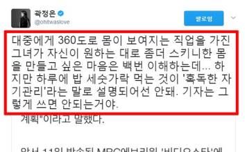 방송인 겸 작가 곽정은이 최근 화제를 모은 ‘이태임 다이어트’와 관련해 자신의 생각을 밝혔다.곽정은은 최근 자신의 트위터에 ‘이태임 다이어트’ 관련 기사를 캡처해 올리며 “하루에 밥 세 숟가락 먹는 것이 ‘혹독한 자기관리’라는 말로 설명되어선 안 된다”고 적었다.그는 “대중에게 360도로 몸이 보이는 직업을 가진 그녀가 자신이 원하는 대로 좀 더 스키니 한 몸을 만들고 싶은 마음은 백번 이해한다”면서도 ‘혹독한 자기관리’라는 표현은 다소 부적절하다고 분석했다.이어진 게시물에서 곽정은은 “그건 그저 몸을 혹사하는 일이라서 팩트로서도 틀린 표현이고 ‘밥 세 숟가락으로 하루를 버틸 정도는 되어야 자기관리하는 사람(특히 여성)’이라는 억압적 가치판단이 전달될 수 있어 나쁜 표현”이라고 덧붙였다.앞서 이태임은 지난 11일 방송된 MBC 에브리원 ‘비디오스타’에 야윈 모습으로 출연했다. 이태임은 자신만의 다이어트 비법으로 “하루에 밥 세 숟가락만 먹었다”고 고백했다. 달라진 얼굴에 급기야 성형설까지 불거졌다. 이에 대해 소속사 매니지먼트 해냄 측은 지난 12일 “이태임이 지난해부터 다이어트를 통해 살을 뺐다. 거식증이나 성형은 아니다”고 공식입장을 밝혔다. 그러면서 “이태임이 지난해 9월께부터 본격적인 다이어트를 시작해 6~7㎏ 체중 감량에 성공한 상태”라고 했고, “항간에 들리는 성형설은 사실무근이다. 그리고 섭식장애로 인한 자연스러운 다이어트도 아니다”라고 설명한 바 있다.온라인 일간스포츠 2017.04.17 08:48