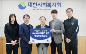 수원FC와 수원FC 위민 선수단이 최근 발생한 영남권 대형 산불 피해 복구를 위해 성금 1000만 원을 기부했다. 이번 기부는 수원FC의 공식 스폰서인 대한사회복지회를 통해 이뤄졌으며, 피해 지역의 복구 작업과 이재민 일상 회복 지원을 위해 사용될 예정이다.4일 오전 서울 강남구 대한사회복지회에서 열린 성금 전달식에는 대한사회복지회 강대성 회장과 수원FC 김은중 감독, 수원FC 위민 박길영 감독을 비롯해 남녀 선수단 대표로 지동원, 최소미가 참석했다. 선수단을 대표해 전달된 성금은 산불로 인해 삶의 터전을 잃은 이재민들을 돕고 피해 지역을 복구하는 데 쓰일 예정이다.수원FC 최순호 단장은 “최악의 산불로 고통받고 있는 분들에게 조금이나마 힘이 되기를 바라는 마음으로 남녀선수단이 함께 기부를 결정했다”며 “이재민 분들과 피해 복구에 힘쓰시는 관계자 분들 모두 어서 일상으로 돌아갈 수 있길 바란다”고 전했다.한편, 수원FC는 지난해 2023시즌 실착 유니폼 경매 수익금을 대한사회복지회를 통해 기부한 바 있으며, 올해에도 공식 나눔 파트너로서 다양한 사회공헌 활동을 위한 협업을 지속적으로 이어가고 있다.이은경 기자 2025.04.05 09:58