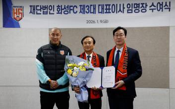 재단법인 화성FC(이하 화성FC)가 송종국 신임 대표이사(66) 취임을 알렸다.취임식은 지난 9일 화성종합경기타운에서 열렸으며, 정명근 구단주와 차두리 감독을 비롯한 구단 임직원들이 참석해 자리를 빛냈다.송종국 신임 대표이사는 국제 스포츠 행정과 체육 분야의 학계·정책 경험을 두루 갖춘 인물이다. 2010년 7월 세계태권도연맹 기획조정실장을 맡아 조직 운영과 중장기 기획 업무를 수행했으며, 2015년 6월 세계태권도연맹 교육분과위원장으로서 교육 체계 발전과 제도 운영 전반에 참여하며 전문성을 쌓아왔다.또한 2018년 2월 경희대학교 체육대학장 및 체육대학원장을 역임하며 체육 인재 양성과 학사 운영을 이끌었고, 2021년 4월 대한체육회 종목정책자문단위원장으로 활동하며 종목 정책 자문 및 제도 개선 논의에도 참여하는 등 체육계 전반에 대한 폭넓은 시야와 현장 이해도를 갖췄다.화성FC는 송종국 대표이사 취임을 계기로 구단 운영 체계를 한층 고도화하고, 프로 무대에서의 경쟁력 강화를 위한 중·장기 전략 수립과 실행에 속도를 낸다는 계획이다. 아울러 지역사회와의 접점을 확대하며 시민구단으로서의 정체성을 공고히 하고, 구단이 축구를 통해 지역과 함께 성장하는 기반을 더욱 탄탄히 다져갈 방침이다.송종국 신임 대표이사는“‘2026년 화성시민과 함께 더 높은 곳으로’라는 시즌 슬로건과 함께 화성FC는 시민과 함께 호흡하며 더 높은 목표를 향해 흔들림 없이 도약하겠다. 경기장 안에서는 끝까지 포기하지 않는 투지로, 경기장 밖에서는 책임과 신뢰의 경영으로 시민이 자랑스러워하는 구단을 만들어가겠다”라고 소감을 밝혔다.이은경 기자 2026.01.11 11:32