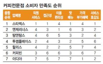 커피 매장 분위기와 시설은 '카페베네', 커피 맛은 '커피빈', 커피 가격과 고객 충성도는 '할리스커피'가 으뜸인 것으로 조사됐다. 한국소비자원과 카이스트 공정거래연구센터는 지난 24일 6개 대형커피전문점을 이용한 소비자 1020명을 상대로 고객 만족도를 조사했다. 이 중 카페베네의 매장 분위기와 시설에 대한 만족도가 7점 만점에 평균 5.32점으로 가장 높았다. 카페베네에 이어 '엔제리너스'(5.08점), '스타벅스'(5.03점)가 뒤를 이었다. 커피 맛에 대한 만족도는 '커피빈'이 5.03점으로 1위였으나 다른 업체들과 차이가 작았다. '탐앤탐스'(4.99점)·할리스커피(4.98점)·스타벅스(4.96점)·카페베네(4.95점) 등 맛에 대한 만족도는 비슷했다.가격에 대한 만족도는 업체 평균이 4.10점에 그쳤다. 할리스커피가 4.43점으로 그나마 가장 나았고, 탐앤탐스(4.24점)·엔제리너스(4.16점)·카페베네(4.04점) 순이었다. 고객 혜택 또한 할리스커피가 4.68점으로 1위에 올랐다. 대형커피전문점을 이용하는 이유에 대해서는 '커피·차나 기타 음료의 맛이 좋아서'가 24.5%로 가장 많았고 '매장 분위기나 시설이 좋아서'(16.8%), '주변에 많아 가기 편해서'(19.4%), '휴식하기 편리해서'(18.2%)가 뒤를 이었다. 지난해 우리나라 국민이 마신 커피는 모두 228억잔으로 1인당 452잔에 달하며, 상위 10개 업체의 매장은 2500곳을 넘는다. 소비자원 측은 "대형커피전문점 서비스의 만족도 평균은 4.83점으로 아주 만족하지도 않지만 그렇다고 불만스럽지도 않은 수준"이라며 "세부적으로 보면 이용 편의성은 높으나 커피 값이 너무 비싸 가격 만족도는 상대적으로 떨어진다"고 말했다.