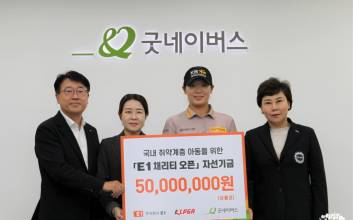 한국여자프로골프협회(KLPGA)가 친환경 에너지 기업 E1과 함께 '제11회 E1 채리티 오픈'의 자선기금을 전달했다고 밝혔다. KLPGA와 E1은 ‘제11회 E1 채리티 오픈’을 통해 자선기금 약 1억1천5백여만 원(KLPGA 3500여 만 원, E1 기부금 8000만 원)을 조성했고, KLPGA는 21일부터 이틀에 걸쳐 기금 및 물품 전달식을 진행했다.먼저 21일에는 글로벌 아동권리 전문 NGO 굿네이버스와 서울시립 금천 여자단기 청소년쉼터를 방문해 자선기금 및 물품을 전달했다. 가정 밖 청소년 보호시설인 서울시립 금천 여자단기청소년쉼터에는 100만 원 상당의 물품과 함께 220 여 만원의 기금을 전달했고, 지역아동센터 및 아동양육시설 등을 통해 취약계층 아동을 지원하는 굿네이버스에는 KLPGA와 E1이 함께 2500만 원씩을 모아 총 5000만 원을 전달했다.굿네이버스 전달식에는 KLPGA 김순미 수석부회장과 E1 전진만 대외협력실장, 굿네이버스 박정순 아동권리옹호본부장을 비롯해 ‘제11회 E1 채리티 오픈’에서 루키로서 생애 첫 우승을 일궈낸 방신실까지 참석해 자리를 빛냈다.KLPGA 선수 대표로 참석한 방신실은 "프로 데뷔 후 생애 첫 우승의 감동을 안겨준 ‘E1 채리티 오픈’을 통해 이렇게 의미 있는 기부 행사에 참여하게 되어 정말 기쁘고, 이 자리에 참석하게 되어 영광이다. 뜻깊은 기회를 주신 KLPGA와 E1, 그리고 굿네이버스에 진심 어린 감사의 말씀을 전하고 싶다”면서 “자선기금을 통해 어려운 환경에 있는 분들뿐만 아니라 사회 전체에 좋은 영향을 줄 수 있으면 좋겠다”는 성숙한 말을 덧붙였다.22일에는 KLPGA 김순희 전무이사가 무주택저소득 모자가정을 지원하는 창신모자원과 여성노인양로원인 성녀 루이제의 집을 방문해 각각 200만 원의 기금과 150만 원 상당의 물품을 전달하며 따뜻한 마음을 함께 나눴다.이은경 기자