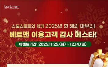 서울올림픽기념국민체육진흥공단(이사장 하형주)이 발행하는 체육진흥투표권 스포츠토토의 공식 인터넷 발매사이트 베트맨이 2025년 한 해를 마무리할 수 있는 연말을 맞아 ‘베트맨 이용고객 감사 페스타’를 진행한다고 27일 밝혔다. 이번 행사는 11월 25일부터 오는 12월 14일까지 약 20일간 베트맨을 통해 진행되며, 신규 가입부터 휴면 해제 및 상품 구매 고객까지 다양한 스포츠토토 이용자를 대상으로 푸짐한 벳머니 혜택을 제공하는 연말 감사 프로모션이다. 먼저, ‘신규가입 고객 대상 축하 이벤트’에서는 행사 기간 동안 베트맨 사이트에 신규로 가입한 고객에게 벳머니 10,000원을 즉시 적립해 주는 행사다. 회원 가입 후 이벤트 참여에 동의하면, 벳머니가 자동으로 지급된다. 이어, ‘돌아온 고객 감사 이벤트’에서는 최근 구매 이력이 없거나, 휴면을 해제한 고객에게 벳머니 5,000원을 지급한다.마지막 ‘구매고객 대상 감사 이벤트’에서는 11월 25일부터 12월 8일(월)까지 약 2주간 스포츠토토 상품을 구매한 고객 중 5,000명을 추첨해 벳머니 5,000원을 제공하는 행사다. 구매 금액과 관계없이 참여할 수 있으며, 당첨자는 12월 12일에 발표한다.프로모션을 통해 지급되는 벳머니는 100원 이상부터 100원 단위로 실제 투표권 구매에만 사용할 수 있으며, 예치금 또는 현금으로 환전되지 않는다. 적립일로부터 7일 이내 사용하지 않을 시 자동으로 소멸한다.한편, 이번 이벤트는 오는 12월 14일까지 참여할 수 있으며, 자세한 내용은 베트맨 내 이벤트 페이지에서 확인할 수 있다. 안희수 기자 2025.11.27 19:05
