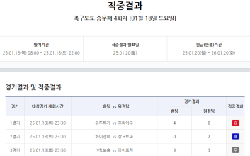 분데스리가에서는 슈투트가르트가 압도적인 경기력을 선보였다. 리그 4위(승점 32점) 슈투트가르트는 안방에서 8위(승점 27점) 프라이부르크를 상대로 4-0 대승을 거뒀다. 슈투트가르트는 전ㆍ후반에 걸쳐 골을 터뜨리며 완벽한 경기를 펼쳤고, 리그 상위권 경쟁에 필요한 중요한 승점 3점을 추가했다. 반면, 리그 16위(승점 14위) 하이덴하임은 홈경기에서 14위(승점 17점) 장크트 파울리와의 경기에서 0-2로 패하며 아쉬운 결과를 남겼다.이와 관련해 스포츠토토코리아 관계자는 “축구토토 승무패 4회차에서 1등 적중 6건이 발생했다”며, “해외축구를 대상으로 하는 축구토토 승무패 5회차 게임에도 많은 관심과 참여를 부탁한다”고 전했다. 한편, 스포츠토토코리아는 지난 해 11월 1일부터 본격적으로 ‘체육진흥투표권 적중결과 조회용 QR코드 서비스'를 시행하고 있다. QR코드 서비스는 구매자가 적중결과 확인을 위해 투표권 우측 상단에 인쇄된 QR코드를 스마트폰으로 스캔하면, 해당 투표권의 적중 결과를 바로 확인할 수 있는 방식이다. 이를 이용하면, 별도 확인 절차 없이 빠르고 간편하게 구매한 투표권의 적중결과를 조회할 수 있다 더불어, 축구토토 승무패 5회차에 대한 자세한 일정 및 경기 분석 내용은 공식 온라인 발매사이트 베트맨 내 토토가이드 페이지에서 확인할 수 있다.안희수 기자
