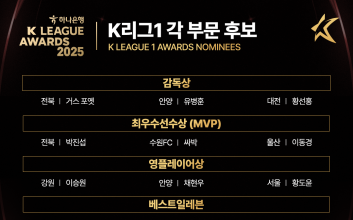 한국프로축구연맹은 ‘하나은행 K리그 2025 대상 시상식’을 앞두고, 지난 19일(수) K리그 개인상 후보선정위원회(이하 ‘위원회’)를 열어, 올 시즌 K리그1, 2 최우수감독상, 최우수선수상(MVP), 영플레이어상, 베스트일레븐 부문의 3배수 후보를 선정했다.위원회는 연맹 기술위원회(TSG) 위원, 취재기자, 해설위원 등 올 시즌 현장에서 많은 경기를 지켜본 전문가들로 구성됐다. 위원회는 각 구단이 제출한 부문별 후보 명단을 기반으로 시즌 기록과 활약을 종합적으로 검토해 최종 후보를 선정했다.선정된 후보들은 24일(월)부터 각 구단 감독(30%), 주장(30%), 미디어(40%) 투표를 통해 수상자를 가린다. K리그1·2 베스트11은 시상식 당일인 내달 1일(월) 오전 사전 공개할 예정이며, MVP·영플레이어·감독상 수상자는 같은 날 오후 3시 서울 홍은동 스위스그랜드호텔에서 열리는 ‘하나은행 K리그 2025 대상 시상식’ 현장에서 발표된다.개인상은 최우수감독상, 최우수선수상(MVP), 영플레이어상 각 1명, 베스트일레븐은 골키퍼 1명, 수비수 4명, 미드필더 4명, 공격수 2명이 수상의 영광을 안는다. 베스트일레븐 수비수와 미드필더 부문은 좌·우·중앙 포지션을 구분해 수상자를 결정한다.한편, 이번 대상 시상식에는 사전 이벤트로 선정된 팬 약 300명이 함께하게 된다. 참석을 원하는 팬들은 K리그 공식 인스타그램 프로필 링크를 통해 신청서를 제출하면 된다. 신청 기간은 20일(목)부터 24일(월)까지이며, 당첨 여부는 25일(화) 개별 문자 메시지를 통해 안내할 예정이다. ▲2025시즌 K리그 개인상 후보명단■ K리그1○ MVP박진섭(전북), 싸박(수원FC), 이동경(울산)○ 영플레이어이승원(강원), 채현우(안양), 황도윤(서울)○ 감독상거스 포옛(전북), 유병훈(안양), 황선홍(대전)○ 베스트11- GK김경민(광주), 송범근(전북), 황인재(포항)- DF 좌김진수(서울), 김태현(전북), 이명재(대전)- DF 중앙변준수(광주), 안톤(대전), 야잔(서울)이창용(안양), 전민광(포항), 홍정호(전북)- DF 우김문환(대전), 김태환(전북), 조성권(광주)- MF 좌김승섭(제주), 송민규(전북), 윌리안(수원FC)- MF 중앙김봉수(대전), 김진규(전북), 박진섭(전북)세징야(대구), 오베르단(포항), 토마스(안양)- MF 우강상윤(전북), 모재현(강원), 문선민(서울)- FW모따(안양), 싸박(수원FC), 이동경(울산)이호재(포항), 전진우(전북), 주민규(대전)■ K리그2○ MVP발디비아(전남), 에울레르(서울E), 제르소(인천)○ 영플레이어박승호(인천), 백지웅(서울E), 이건희(수원)○ 감독상윤정환(인천), 이영민(부천), 전경준(성남)○ 베스트11- GK민성준(인천), 양한빈(성남), 양형모(수원)- DF 좌김예성(전남), 이기제(수원), 이주용(인천)- DF 중앙김건희(인천), 김오규(서울E), 레오(수원)베니시오(성남), 조위제(부산), 홍성욱(부천)- DF 우신재원(성남), 이건희(수원), 장호익(부산)- MF 좌박지원(수원), 박창준(부천), 제르소(인천)- MF 중앙발디비아(전남), 박창환(서울E), 박현빈(부천)서재민(서울E), 이규성(수원), 이명주(인천)- MF 우세라핌(수원), 에울레르(서울E), 페신(부산)- FW루이스(김포), 무고사(인천), 바사니(부천)일류첸코(수원), 호난(전남), 후이즈(성남)김희웅 기자 2025.11.20 11:15