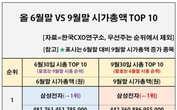 올해 3분기 시총 상위 100위 중 59곳 하락, 삼성전자 40조 증발