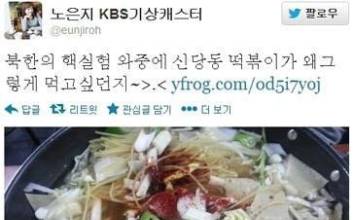 KBS 기상캐스터 노은지가 떡복이를 먹고 싶다는 발언으로 논란의 중심에 섰다.노은지는 12일 자신의 트위터에 '북한의 핵실험 와 중에 신당동 떡볶이가 왜 그렇게 먹고 싶던지'라는 글과 함께 한 장의 사진을 공개했다.사진은 떡과 라면사리, 각종 야채 등을 넣어 만든 신당동 떡볶이. 노은지는 떡볶이를 먹고 싶다는 글과는 전혀 상관없는 북한 핵실험을 언급해 비난을 안 먹어도 될 욕을 먹고 있다. 북한이 3차 핵실험을 감행했다는 소식이 전해진 뒤라 더욱 비난의 소리가 커지고 있다.네티즌은 '무개념이다. 이건 좀 심하네' '핵실험이랑 떡볶이가 무슨 상관? 이런 건 그냥 혼자 생각하지' '안보에 대한 불감증을 이렇게 무지하게 드러낼 수 있는지 안타깝다'고 지적했다.해당 글은 현재 삭제된 상태다. 김진석 온라인 뉴스 기자 superjs@joongang.co.kr 2013.02.13 15:19