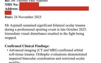 아스피날은 10월 26일 아랍에미리트(UAE) 아부다비 에티하드 아레나에서 열린 UFC 321 메인이벤트에서 간에게 눈을 찔렸다. 이 경기는 헤비급 타이틀전이었는데, 아스피날이 경기를 이어가지 못하겠다는 의사를 보였다. 결국 경기는 무효 처리됐다.비난의 화살은 아스피날에게 향했다. 눈을 찔린 아스피날이 엄살 피웠다는 반응이 주를 이뤘다. 그동안 눈을 찔려도 싸움을 강행했던 파이터들이 많았던 탓이다.아스피날은 결국 병력까지 공개했다.MMA 파이팅은 “병력에는 아스피날이 심각한 양 측 눈 외상을 당했다고 명시돼 있다”며 “클리블랜드 클리닉에 따르면, 아스피날의 부상은 브라운 증후군과 같은 징후를 보인다고 밝혔다”고 짚었다.브라운 증후군은 눈의 움직임을 제어하는 근육이나 힘줄에 문제가 생기는 질환이라고 부연했다.