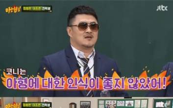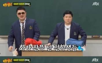 '아는형님' 형돈이와 대준이가 8년차 그룹의 완벽한 호흡을 자랑했다.16일 오후 방송된 JTBC '아는형님'에서는 '형돈이와 대준이'의 정형돈, 데프콘이 전학생으로 출연했다.이날 정형돈과 데프콘은 "아이돌룸에서 동거하는 8년째 그룹 형돈이와 대준이다"라고 자신들을 소개했다. 아이돌 징크스 7년 차를 슬기롭게 넘겼다는 두 사람. 그동안 여러 번의 섭외 요청이 있었음에도 '아는형님'에 출연하지 않았던 이유에 대해 데프콘은 "이런 프로그램은 연예인 신변이나 최근 근황이나 그런 이야깃거리가 없다"고 밝혔다.이때 김희철은 "사실 데프콘 형이 '아형'에 대한 인식이 안 좋았다. 과거 '아이오아이' 출연하고 프로그램이 막 뜨려던 때 '너무 독하던데? 그럼 오래 못 간다'고 하더라"라고 폭로해 데프콘을 당황케 했다. 이에 데프콘은 "장기적으로 보려면 힘들 것 같아서 걱정돼서 한 말이다"라고 해명했다.아형 멤버들은 데프콘의 섭외에 공을 들였으나 쉽게 승낙하지 않았다고 전했다. 정형돈과 함께 출연하겠다며 미뤘다고. 정형돈은 "사실 '아형'에서 섭외 들어온지 3년이 됐다. 나는 대형 프로에 맞지 않는다 생각해서 출연을 망설였다"라며 "그런데 얼마 전 장훈이가 '옥탑방의 문제아들' 게스트로 나와서 제작진의 부름을 받고 나를 섭외하더라. 그냥 나오기가 뭐해서 신곡도 만들어서 나왔다"고 밝혔다.이날 아형 멤버들은 두 사람에게 "형돈이와 대준이 팀 내 서열이 있냐"고 물었다. 이에 데프콘은 "서열이 암묵적으로 있다. 형돈이가 1위, 나는 막내다"라고 밝혔다.같이 다닐 때 왜 항상 데프콘이 짐을 들어주냐는 질문에는 "항상 그런 건 아니다. 그런데 아무래도 내가 패션을 담당하다보니까 그런 면이 있다"라며 "내가 형돈이 때문에 잘 됐고 돈을 벌었다"고 말했다. 이를 들은 강호동이 흥분하며 "데프콘이 고마워서 그런 건 이해하지만 형돈이가 그러면 안 된다"고 다그치자 데프콘은 "난 이게 좋다. 형돈이에게 늘 고맙고 내가 다 할거다"라고 정형돈을 감쌌다.이어 수익배분에 대한 질문이 나오자 "대외적으로 5:5 말했던 대로 실제 5:5다. 그러니까 내가 행복한 거다. 고향에 내려가려다가 형돈이 덕에 대박이 났다"고 털어놔 모두를 폭소케 했다.또 데프콘은 '형돈이와 대준이'의 음악 작업에 대해 "형돈이가 아이디어에 대한 단어나 문장을 있는대로 나열하면 내가 정리한다"라며 "어쩔 땐 그 양이 더 많을 때도 있지만 형돈이를 단독 작사로 올린다. 그래도 행복하다"고 말해 웃음을 자아냈다. 이후 데프콘이 이야기를 이어가던 중, 정형돈은 "너희들만 앉아있는 것 같아서"라며 의자를 가져다 앉았다. 이수근이 "이왕이면 데프콘 것도 가져가지 그러냐"고 말하자 데프콘은 "나 서 있는 거 좋아해"라고 재빠르게 답하며 형돈바라기의 모습을 보였다.김희철은 형돈이와 대준이의 '한 번도 안 틀리고 누구도 부르기 어려운 노래'를 언급했다. 정형돈과 데프콘은 KBS2 '유희열의 스케치북'에서 처음으로 라이브 무대에 도전한 바 있다. 당시 데프콘은 1세대 래퍼답게 완벽한 딕션과 플로우로 큰 호응을 얻었다. 정형돈은 "그때 스튜디오에 1000명이 있었는데 (데프콘 무대에) 숨소리도 못 냈다"고 말하며 데프콘을 치켜세웠다. 곧이어 두 사람은 '한 번도 안 틀리고 누구도 부르기 어려운 노래' 라이브 무대를 완벽히 선보여 감탄을 안겼다.입학신청서를 발표하는 시간. 데프콘은 별명이 '돌 젖꼭지'였다고 밝혀 궁금증을 자아냈다. 데프콘은 "내가 이름이 대준이잖나. 그런데 어느날 아버지가 '너 이름 바꿔야겠다'라며 '이름을 바꾸면 더 잘 된다'고 하셨다"고 말했다. 아버지가 가져오신 이름은 두석이었다고.데프콘은 "내 성이 유씨라 유두석이 됐다. 학교에 갔더니 애들이 다 돌 젖꼭지라고 놀렸다. 처음엔 '유머 일번지'의 부채도사 장두석 씨를 떠올리며 너무 좋다고 생각했는데 애들이 하도 놀리니까 부모님께 사태의 심각성을 알렸다. 그래서 대준이로 다시 돌아왔다"고 밝혀 웃음을 자아냈다. 이어 데프콘은 자신의 장점으로 이쑤시개 이마로 옮기기, 젤리 빨리 먹기 등을 가져와 압도적인 실력을 보였다.자리를 정비하고 의자에 착석한 정형돈은 아형 급훈을 보며 "왜 '재석이가 보고 있다'야?"라고 물었다. 강호동은 "우리가 도달해야 할 목표"라고 말했고, 김희철은 이를 받아 "우리나라 탑 MC 유재석, 신동엽, 전현무다"라고 말해 정형돈을 놀라게 했다. 정형돈은 "진짜 호동이랑 방송하기 편해졌구나. 그런 멘트는 목숨 걸고 하는 거다"라며 김희철의 용기에 혀를 내둘렀다.이날 데프콘은 '형돈이의 이해할 수 없는 행동'에 대한 문제를 출제했다. 서장훈은 "'서프라이즈' 보는 것"이라며 "같이 프로그램 녹화하고 해외에서 같은 방을 쓸 때 '서프라이즈'를 안 본 적이 없다"고 말했다. '옥탑방의 문제아들'에서 문제를 맞힐 수 있는 원천도 모두 '서프라이즈'를 통해 나오는 거라고. 이에 정형돈은 히틀러 생존설, 1달러 지폐 뒷면의 비밀 등 미스터리에 관한 즉석 강의를 하기 시작했다. 이를 가만히 지켜보던 이상민은 정형돈에게 달려가 공황장애 약을 건네 웃음을 자아냈다. 그러나 정답은 따로 있었다. 데프콘은 찬 걸 마시고 