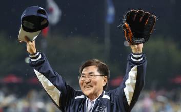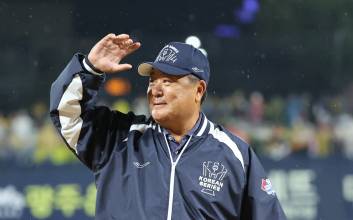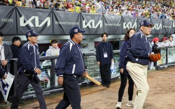 2024 신한 쏠뱅크 KBO 한국시리즈 1차전 삼성과 KIA의 경기가 21일 오후 광주 기아챔피언스필드에서 열렸다. 시포를 한 김종모 KBO 재능기부위원이 인사하고있다 KIA 타이거즈와 삼성 라이온즈의 왕조를 이끌었던 김응용 전 대한야구소프트볼협회 회장이 시구했다. 시타는 김성한 전 KIA 감독이 했다. 광주=정시종 기자 capa@edaily.co.kr /2024.10.21. 2024.10.21 19:53