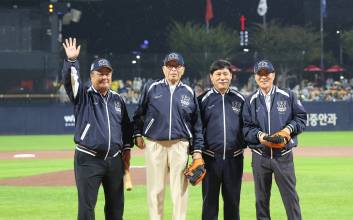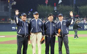 2024 신한 쏠뱅크 KBO 한국시리즈 1차전 삼성과 KIA의 경기가 21일 오후 광주 기아챔피언스필드에서 열렸다. KIA 타이거즈와 삼성 라이온즈의 왕조를 이끌었던 김응용 전 대한야구소프트볼협회 회장이 시구했다. 시타는 김성한 전 KIA 감독, 시포는 김종모 KBO 재능기부위원이 했다. 행사후 허구연 KBO총재와 기념 쵤영하고있다. 광주=정시종 기자 capa@edaily.co.kr /2024.10.21. 2024.10.21 19:55