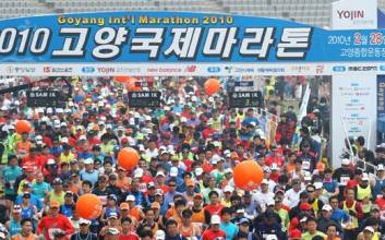 2010 고양국제마라톤에 참가한 선수들이 고양종합운동장의 출발선을 나서고 있다. 이날 8200여명의 선수들이 참가해 포근한 날씨 속에 마라톤을 즐겼다.  엘리트 여자하프 부문 1위를 차지한 페니나 제롭 아루세이(케나)가 골인하는 장면. 고양=김민규 기자 2010 고양국제마라톤이 2월 28일 포근한 날씨 속에 성황리에 개최됐다. 올해는 지난해 보다 두 배나 많은 8200여 명이 참가해 고양종합운동장∼호수로∼대화마을 등 고양시 일산신도시 일대 코스를 달렸다. 고양시·대한육상경기연맹·중앙일보·일간스포츠가 공동 주최한 이번 대회는 국제여자 하프코스를 비롯해 일반부문 풀코스, 하프코스, 10㎞, 5㎞ 등 5개 부문으로 나눠 진행됐다. 올해 4회째를 맞아 '엘리트 여자 하프 부문'을 신설해 국제대회로 격상됐다. 과거 국제 무대를 주름잡았던 여자 스포츠 스타들이 대거 참가해 눈길을 끌었다. 탁구 '사라예보의 전설' 정현숙, 농구 국가대표 센터 박찬숙·정은순, 애틀랜타 올림픽 양궁 금메달리스트 김경욱 등 은퇴한 여자 국가대표들의 모임인 한국여성스포츠회 회원들이 100여명이 단체로 참가했다.5㎞ 부분에 참가한 정현숙 한국여성스포츠회 회장은 "예전에는 메달을 따는 것이 불가능해 보였던 동계올림픽 피겨에서도 금메달을 땄는데 마라톤 여자는 아직 올림픽 금메달이 없다. 앞으로 여성 스포츠회 차원에서 마라톤에 관심을 가질 것"이라고 말했다. 마라톤에 처음 참가했다는 박찬숙 부회장은 "봄바람을 맞으며 호수공원 옆을 달리니 무척 상쾌했다. 코스가 아름답고 날씨까지 좋아 오래 기억에 남을 것 같다"고 즐거워했다. 정은순씨는 남편, 딸 둘과 함께 온 가족이 5㎞를 완주했다. 결승선에서는 육상스타 장재근씨와 황영조씨가 심판으로 참가해 선수들의 기록을 직접 확인하고 순위를 매겼다. 이날 대회 엘리트 여자 하프 부문에서는 케냐의 페니나 제롭 아루세이 선수가 1시간 8분 35초의 기록으로 우승을 차지했다. 풀코스(일반 부문)에서는 강호(45)씨가 2시간 33분 3초의 기록으로 남자 1위를, 양점조(43)씨가 3시간 19분 1초의 기록으로 여자 1위를 차지했다. 하프코스에서는 김정룡 선수가 남자 1위(1시간 17분 28초), 이정숙 선수가 여자 1위(1시간 23분 59초)로 각각 골인했다. 한용섭 기자