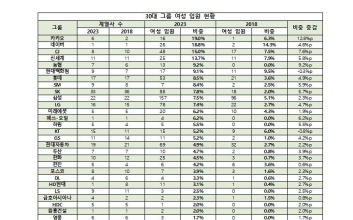국내 30대 그룹의 여성 임원 비중이 5년 사이 2배 이상 커진 것으로 나타났다. 개정 자본시장법 시행 등의 영향 때문으로 풀이된다. 기업분석연구소 리더스인덱스는 19일 자산 상위 30대 그룹 계열사 중 사업보고서를 제출하는 265개 기업의 여성 임원 현황 분석 결과를 발표했다. 조사 결과 올해 1분기 말 이들 기업의 여성 임원은 726명으로 전체 임원(1만561명) 가운데 여성은 6.9%였다. 여성 임원 수는 2018년 1분기(271명)보다 455명 늘었고, 여성 임원 비중은 5년 전(3.2%)보다 3.7% 상승했다.여성 임원 비중이 가장 큰 그룹은 카카오그룹이었다. 카카오 6개 계열사 임원 84명 중 여성은 19.0%에 해당하는 16명이었다. 이어 여성 임원 비중은 네이버 18.8%(26명), CJ 15.0%(48명), 신세계 13.7%(25명) 등 순이었다.여성 임원 수가 가장 많은 그룹은 삼성이었다. 삼성 22개 계열사 임원 2천97명 중 여성은 157명(7.5%)으로 집계됐다. 이어 SK 88명(7.8%), LG 78명(7.4%), 현대차 69명(4.9%), 롯데 53명(8.5%) 순으로 나타났다.반면 2018년 1분기에는 여성 임원이 한 명도 없는 그룹이 8곳이었으나 올해 1분기에는 여성 임원이 한명도 없는 그룹은 HMM이 유일했다. 또 올해 1분기 30대 그룹 265개 계열사에서 여성 임원이 없는 곳은 86곳으로 전체의 32.4%를 차지했다. 5년 전에는 조사 대상 중 여성 임원이 없는 곳이 188곳(70.9%)에 달했다.지난해 8월부터 시행된 개정 자본시장법은 자산총액 2조원 이상 상장사의 이사회를 특정 성이 독식하지 않도록 규정하고 있다. 다만 같은 기간 사내이사 가운데 여성 비중은 1.7%(12명)에서 2.8%(25명)로 1.1% 늘어나는 데 그쳤다.미등기 여성 임원의 증가세도 두드러졌다. 30대 그룹의 미등기 임원 중 여성 임원은 2018년 1분기 243명에서 올해 1분기 546명으로 증가했다. 미등기 임원 전체에서 여성이 차지하는 비중은 3.4%에서 6.2%로 2.8% 상승했다.김두용 기자 k2young@edaily.co.kr