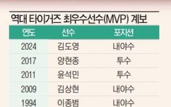 이변은 없었다. 올 시즌 KBO리그 '최고의 별'은 내야수 김도영(21·KIA 타이거즈)이었다.김도영은 26일 서울 송파구 롯데호텔 월드에서 열린 2024 한국야구위원회(KBO) 시상식에서 기자단 투표 101표 중 95표(득표율 94.06%)를 휩쓸어 정규시즌 최우수선수(MVP)로 선정됐다. 타이거즈 선수로는 2017년 투수 양현종 이후 7년 만이자 역대 10번째. 야수로는 2009년 김상현 이후 무려 15년 만에 MVP 트로피를 들어 올렸다. 리그 역대 두 자릿수 MVP를 배출한 구단은 KIA(전신 해태 포함·2위 삼성 라이온즈 9회)가 사상 처음이다.김도영은 올 시즌 타율 0.347(544타수 189안타) 38홈런 143득점 109타점을 기록했다. 출루율(0.420)과 장타율(0.647)을 합한 OPS가 1.067로 리그 전체 1위. 도루까지 40개(성공률 90.9%)를 해내며 리그 역대 세 번째 '타율 0.300-30홈런-30도루-100득점-100타점' 금자탑을 쌓았다. 그뿐만 아니라 지난 4월 리그 사상 첫 월간 10홈런-10도루 달성을 시작으로 역대 5번째 전반기 20-20 클럽, 역대 최연소·최소 경기 30-30 클럽, 역대 최연소 선점·최소 경기 100득점, 역대 두 번째 내추럴 사이클링 히트(단타부터 홈런까지 차례로 때려내는 기록), 단일 시즌 득점 신기록(종전 135득점) 등을 두루 해냈다.