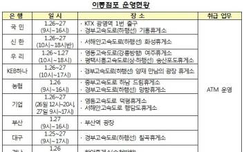 시중은행들이 설 연휴 기간 동안 고속도로 휴게소 등에서 이동점포를 운영해 이용자들에게 편의를 제공할 예정이다.금융감독원은 설 연휴에 알아두면 유익할 금융정보를 25일 공개했다.국민·신한·우리·KEB하나은행 등 9개 시중은행들은 설 연휴 기간 동안 고속도로 휴게소와 기차역 등에서 입·출금 등 은행업무가 가능한 이동점포를 운영한다.국민은행은 26일부터 27일까지 KTX 광명역 1번 출구와 경부고속도로(하행선) 기흥휴게소에 이동점포를 설치한다. 운영시간은 오전 9시부터 오후 4시까지다.신한은행은 귀경이 몰리는 26일과 27일 양일간 오전 10시부터 오후 6시까지 서해안고속도로(하행선) 화성휴게소에 이동점포를 운영한다.이외에 우리은행은 영동고속도로(강릉방향) 여주휴게소와 평택시흥고속도로(상·하행선) 송산포도휴게소, KEB하나은행은 경부고속도로(하행선) 양재 만남의 광장 휴게소에서 이동점포를 운영한다.금감원은 "이동점포에서 간단한 입·출금 서비스를 제공하고 있으니 해당 은행의 이동점포 위치와 영업일자, 시간 등을 확인하고 이용하면 된다"고 말했다.조은애 기자 cho.eunae@joins.com 2017.01.25 17:19