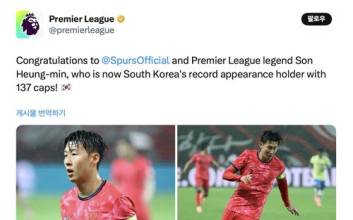 EPL "토트넘 레전드 손흥민, 한국 A매치 최다 출전 축하"