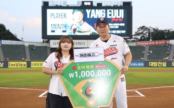 두산 베어스 포수 양의지가 8월 조아제약 월간 MVP(최우수선수)에 선정됐다. 양의지는 이 기간 출전한 24경기에서 타율 0.407(86타수 35안타) 장타율 0.628, 출루율 0.459를 기록했다. 월간 타율 1위, OPS는 4위에 올랐다. 시상은 지난 26일 잠실구장에서 열린 NC 다이노스전에 앞서 열렸고, 조아제약 일반인 이벤트 당첨자 김혜원씨가 맡았다. 두산 제공 2025.10.05 11:00
