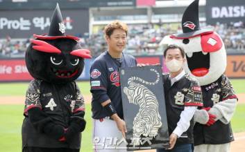 2022 KBO리그 롯데 자이언츠와 KT 위즈의 경기가 18일 오후 수원 kt위즈파크에서 열렸다.경기전 은퇴투어중인 롯데 이대호가 은퇴투어 행사를 했다.이대호가 이재준 수원시장으로부터 큰호랑이가 그려진 맥간공예품을 받고 포토타임을 갖고있다.수원=정시종 기자 capa@edaily.co.kr /2022.09.18. 2022.09.18 14:13