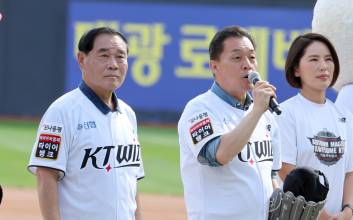 9일 오후 수원 케이티위즈파크에서 열린 LG트윈스와 KT위즈의 2024 신한쏠뱅크 KBO포스트시즌 준플레이오프 4차전. 경기전 수원특례시 이재준 시장과 이재식 시의회 의장이 시구와 시타를 앞두고 KT 선전을 기원하고있다. 수원=정시종 기자 capa@edaily.co.kr /2024.10.09. 2024.10.09 14:08