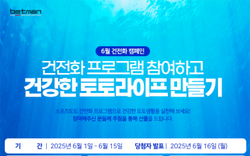 ‘스포츠토토 건전하게 이용하고 치킨 세트와 커피 교환권도 받아 가세요!’국민체육진흥공단이 발행하는 체육진흥투표권 스포츠토토의 공식 인터넷 발매사이트 베트맨이 2025년 5월 건전화 캠페인인 ‘건전화 프로그램 참여하고 건강한 토토라이프 만들기’ 이벤트를 오는 31일까지 진행한다고 밝혔다. 스포츠토토에서는 고객들이 체육진흥투표권을 더욱 건전하게 이용할 수 있도록 공식 인터넷 발매사이트인 베트맨을 통해 매월 ‘건전화 이벤트’를 기획해 제공하고 있다.참여를 원하는 사람들은 베트맨 이벤트 페이지에 접속해 로그인 후 ‘건전구매 바로알기’ 버튼을 이용한 건전화 영상 시청과 세 가지 ‘건전화 프로그램’을 모두 완료하면 캠페인 응모가 자동으로 완료된다. 먼저, ‘건전구매 바로알기’는 스포츠토토에 대한 올바른 구매 방법을 익히고, 건전하게 즐기는 방법 등을 안내하는 동영상이다. 해당 동영상을 시청하거나, 다운로드 시 벳볼 500개(1인 1회)가 지급되며, 바탕화면에 다운로드 하는 경우에도 동일한 혜택이 제공된다. 이어, 세 가지로 구성된 건전화 프로그램은 ‘셀프 진단평가’와 ‘셀프 구매계획’, ‘셀프 휴식계획’으로 나뉘어 있으며, 각각의 프로그램에 한 번씩 참여를 완료하면 된다.  ‘셀프 진단평가’란 회원 스스로 자신의 게임 성향을 진단해 게임 몰입도를 점검할 수 있는 프로그램이며, ‘셀프 구매계획’은 과도한 몰입으로 인한 부작용을 예방하기 위해 스스로 한 주 동안 구매 한도와 횟수를 미리 설정하는 시스템이다. 마지막 ‘셀프 휴식계획’은 스스로 스포츠토토 구매 휴식기를 약속하고 쉬어 가는 캠페인이다.  ‘건전구매 바로알기’와 세 가지 ‘건전화 프로그램’을 완료한 참여자들은 이번 이벤트에 자동으로 응모되며, 추첨을 통해 BHC 뿌링클 치킨 콜라 세트 교환권(10명)과 스타벅스 아메리카노 기프티콘(100명)을 증정한다. 더불어 이벤트 참여자 전원에게는 1인 1회에 한해 베트맨 사이트 내의 다양한 경품 응모가 가능한 벳볼 500개도 지급된다. 한편, 이번 이벤트는 오는 5월 31일까지 참여할 수 있으며, 당첨자는 6월 2일(월)에 공지된다. 자세한 내용은 베트맨 내 이벤트 페이지에서 확인할 수 있다. 안희수 기자