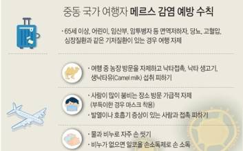 3년여 만에 국내에서 중동호흡기증후군(메르스) 환자가 발생해 비상이다. 당국은 쿠웨이트로 출장을 갔다가 메르스 환자로 확진된 A(61)씨를 입원, 격리하고 밀접 접촉자 21명은 자택 격리, 일반 접촉자 440명은 감시 중이다. 확진자 외 추가 확산 방지에 총력을 기울이고 있는 것. 혹시 모를 메르스 감염을 막기 위해 손을 자주 씻고 의심될 경우 병원에 바로 가지 말고 질병관리본부 콜센터 또는 보건소에 신고해야 한다.다음은 질병관리본부가 권고하는 메르스 예방 행동 수칙이다.▲여행 전에 먼저 질병관리본부 홈페이지(cdc.go.kr)에서 메르스 환자 발생 국가 현황을 확인하고, 특히 65세 이상 고령층, 어린이, 임산부, 암 투병자 등 면역력이 저하된 이는 여행 자체를 자제하는 것이 좋다.▲여행 중 손 씻기 등 개인위생 수칙을 지키고, 농장 방문을 자제하며, 특히 동물(낙타)과 접촉하지 말아야 한다.▲익히지 않은 낙타 고기와 생낙타유는 먹지 말아야 한다.▲진료 목적 외 현지 의료 기관에 방문하거나 사람이 붐비는 장소에는 되도록 가지 말아야 하고, 부득이한 경우 반드시 마스크를 착용해야 한다. 발열이나 호흡기 증상이 있는 사람과도 접촉하지 않아야 한다.▲ 호흡기 증상이 있는 경우 마스크를 쓰고, 기침이나 재채기할 때는 옷소매로 입과 코를 가려야 한다.▲검역감염병 오염 국가를 방문하고 입국 때 설사·발열·기침·구토 등 의심 증상이 있으면 건강상태질문서를 작성해 비행기에서 내릴 때 검역관에게 반드시 제출해야 한다. 질문서를 제출하지 않으면 1000만원 이하의 과태료가 부과된다.▲귀국 이후 2주 이내에 의심 증상이 발생하면 의료 기관으로 가지 말고 질병관리본부 콜센터(1339) 또는 보건소에 신고해야 한다. 권오용 기자 kwon.ohyong@jtbc.co.kr 2018.09.11 07:00