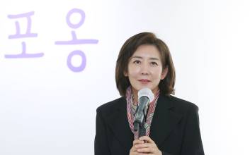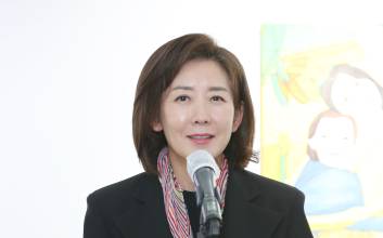 드라마 ‘우리들의 블루스’ 출연 정은혜 작가 초대전 ‘포옹’ 오프닝 리셉션이 5일 오후 서울 중구 KG타워 아트스페이스 선에서 열렸다. 나경원 전 자유한국당 원내표가 축사를 하고 있다. 이번 초대전은 KG그룹 '이데일리 문화재단' 에서 새롭게 명칭이 바뀐 ‘곽재선문화재단’의 첫 전시로 전시 기간은 오늘(5일)부터 29일까지다. 서병수 기자 qudtn@edaily.co.kr /2023.04.05/ 2023.04.05 16:10