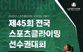 제45회 전국 스포츠클라이밍 선수권대회가 오는 28일 전북 군산에서 열린다. 이 대회는 2025년도 스포츠클라이밍 국가대표를 선발하는 대회다.대한산악연맹은 “오는 28일부터 30일까지 3일간 전북특별자치도 군산시 군산클라이밍센터에서 ‘제45회 전국 스포츠클라이밍 선수권대회’를 개최한다”고 이날 밝혔다.이 대회는 2025년도 대한민국 스포츠클라이밍 국가대표를 선발하는 대회다. 연맹에 따르면 17세 이상 200여명의 스포츠클라이밍 국내 정상급 선수들이 참가해 태극마크를 놓고 치열한 경합을 펼칠 전망이다. 대회는 연맹이 주최하며, 전북특별자치도산악연맹이 주관한다. 신한금융그룹·노스페이스·클라임코리아가 공식 후원, 문화체육관광부·전북특별자치도·대한체육회·군산시·국민체육진흥공단이 후원으로 참여한다. 대회 첫날에는 남·여 스피드 예선과 결승이 진행된다.29일에는 남자 볼더 예선, 준결승, 결승과 여자 리드 예선, 결승이 열린다. 대회 마지막 날인 30일에는 남자 리드 예선, 준결승, 결승이 진행되고, 여자 볼더 예선, 준결승, 결승이 진행된다.이번 대회를 통해 선발된 국가대표 선수들은 오는 9월 서울에서 개최되는 ‘2025 국제스포츠클라이밍연맹(IFSC) 서울 스포츠클라이밍 세계선수권대회’ 출전 자격을 얻게 된다. ‘2025 IFSC 서울 세계선수권대회’는 국내에서 열리는 국제 스포츠클라이밍 대회로, 세계적인 선수들이 참여하는 중요한 대회로 꼽힌다.끝으로 연맹은 “대회는 누구나 무료로 경기를 관람할 수 있다. 또한 대한산악연맹 공식 유튜브 채널을 통해 실시간 중계될 예정”이라고 덧붙였다.김우중 기자